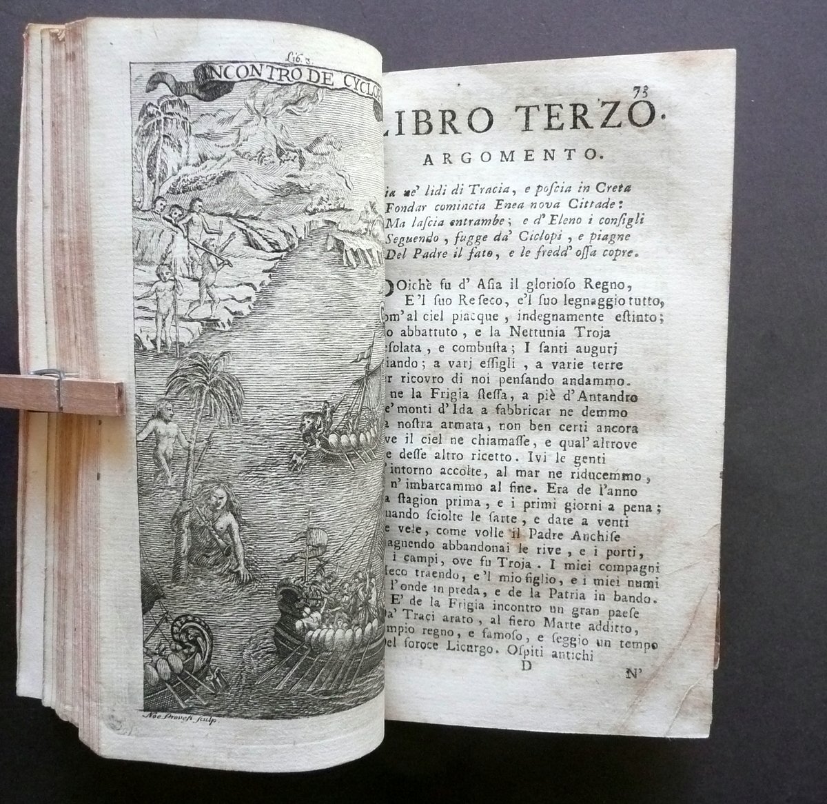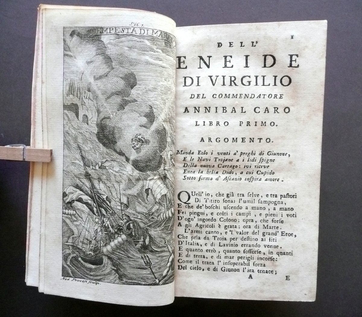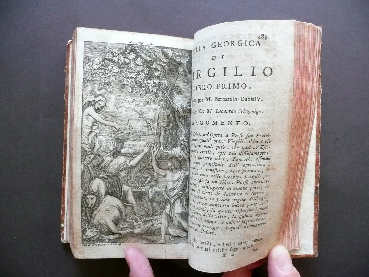 Settecentina, † L'Eneide Virgiliane Tradotte Dal Commendatore Annibal Caro Divise in libri dodici Novissima edizione ornata di figure in rame Con la traduzione della Bucolica, Georgica, e Vita di Virgilio Per Francesco Borsi, Parma 1759, cm 16x9, pp. 588 con qualche fregio inciso e con 15 bellissime tavv. incise in b/n fuori t.; frontespizio con marca tipografica incisa in b/n. Legatura d'epoca in mezza pelle con titolo e qualche fregio impressi in oro al dorso (titolo entro tassello); piatti in carta marmorizzata. Tagli rossi. † Condizioni di conservazione Esemplare complessivamente ben conservato con tracce d'uso e del tempo, coperta con alcune leggere abrasioni e qualche mancanza, con conseguente minimo allentamento del piatto ant. (vedi foto); margini dei piatti con qualche piccolo strappetto. Interni buoni con alcune leggere bruniture e, a qualche pagina, poche piccole lievi ombre di gore che non danneggiano il testo; risguardo post. e qualcuna delle ultime pagine con qualche circoscritta lieve traccia di vecchia umidit‡, le quali non compromettono la lettura del testo; angolo inf. delle pp. 289-90 con una piccola mancanza restaurata mediante l'applicazione di una striscia di carta; antiporta figurata applicata al risguardo ant. (vedi foto). † Bella settecentina delle principali opere di Virgilio (Eneide", "Bucoliche", "Georgiche"), nella celebre traduzione di Annibal Caro, ornata da 15 bellissime tavole incise in bianco e nero (vedi foto). Edizione pregevole e notevolmente curata. † SETT106.L10268 N P "