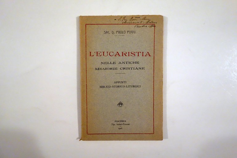 Sac. D. Paolo Poggi, L'Eucaristia nelle antiche chiese cristiane appunti biblico - storico - liturgici Tip. Solari-Tononi, Piacenza 1926; cm 18x12; pp. 92; brossura ed. Al margine superiore della copertina dedica autografa firmata dell'autore (firmata l'Autore). Al frontespizio vecchio timbro di biblioteca, esemplare regolarmente annullato. Condizioni di conservazione Buone condizioni con leggere tracce d'uso; minimi marginali accenni di ingiallimento alla brossura, alle pagine e al dorso dovuti al tipo di carta; alla cuffia inf. un pressoché trascurabile strappetto. SETT45.L24762 N