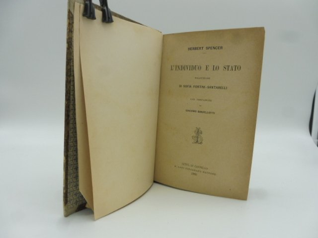 In 16 (cm 12 x 18), pp. CIII + 163. Qualche fioritura sparsa alle pagine. Legatura coeva in mezza pelle. Prima edizione italiana, con traduzione curata da Sofia Fortini Santarelli, dell'opera di Spencer uscita in edizione originale a Londra con il titolo di 'The Man Versus the State', nel 1884. Ampia introduzione di Giacomo Barzellotti.