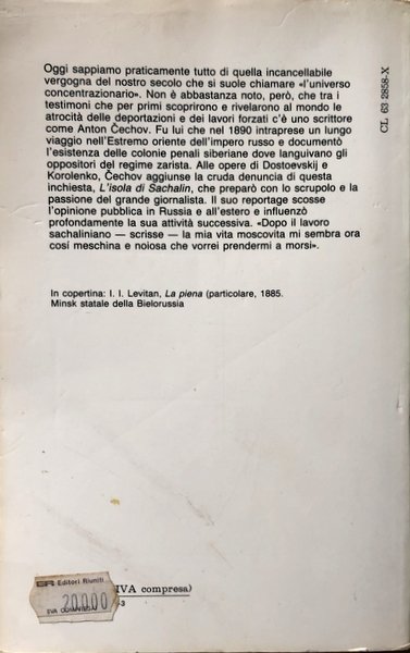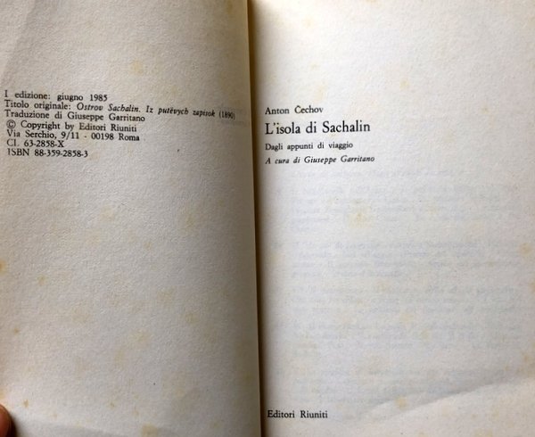 Soggetti: Impero Russo, Fine XIX secolo, Letteratura russa, Classici, Narrativa, Viaggio, Siberia, 1890, Descrizioni Letterarie, Articoli, Taccuini, Diari, Dediche, Sahalìn, Russia, Prigionieri, Campi di lavoro, Lavori forzati, Detenuti, Repressione, Opere letterarie in russo, Suvorin, Novoe vremja, Giornalismo, Katorga, Arkaj, Contadini, Golfo di Nyj, Giljaki, Donne ainu, Miniere, Sakhalin Island, Libri Vintage, Fuori catalogo, Tsarist system, Zar, Impero russo, Esilio, Prigione, Chekhov, Taiga, Penal labour, Penal servitude, Universo concentrazionario, Narrativa concentrazionaria, Oppositori politici, Colonie penali siberiane, Testimonianze, Zápisky z cesty na Sibiř a na ostrov Sachalin. Dojmy z cest i života v tamějších trestaneckých koloniích, Russian Empire, Late 19th Century, Russian Literature, Classics, Fiction, Travel, Literary Descriptions, Articles, Notebooks, Diaries, Dedications, Prisoners, Labor Camps, Forced Labor, Prisoners, Repression, Literary Works in Russian, Journalism, Peasants, Women ainu, Mines, Books out of print, Czar, Russian Empire, Exile, Prison, Concentration Universe, Concentration narrative, Political oppositionists, Siberian penal colonies, Testimonials