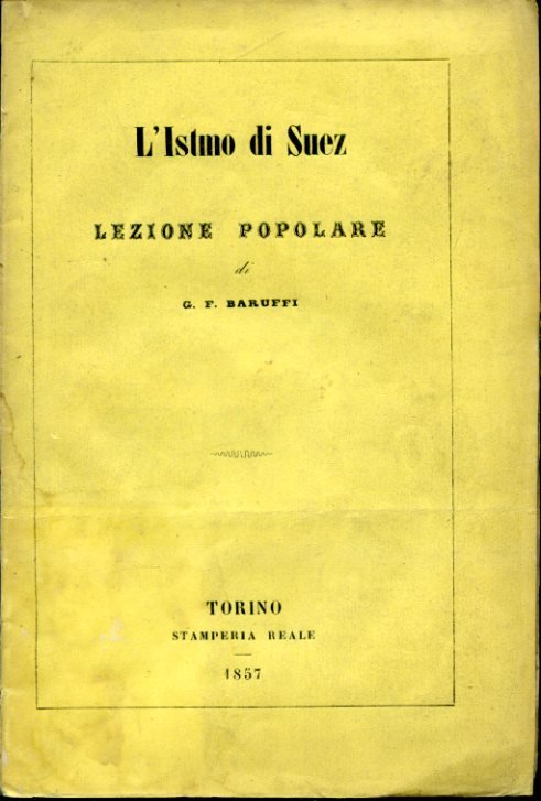 In-16°, pp. 31, brossura editoriale gialla riquadrata. Lievi sottolineature. Un restauro al titolo. Bell'esemplare. Edizione originale. Il Baruffi caldeggia il progetto del de Lesseps per il taglio dell'istmo di Suez, poi portato a compimento nel 1869. L'abate Baruffi (Mondovì, 1809-Torino, 1875) fu viaggiatore e scrittore, professore di geometria e matematica, e poi di filosofia e di teologia, nell'ateneo torinese, membro di numerose accademie. Fra le svariate sue opere, ricordiamo numerosi scritti a carattere locale ed una lettera sull'imminente passaggio della cometa di Halley indirizzata a Cesare Della Chiesa di Benevello nel 1835.
