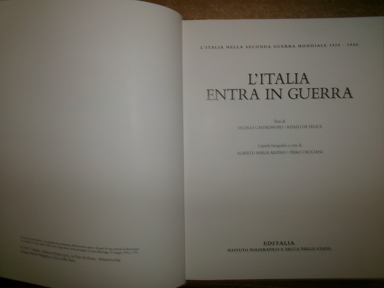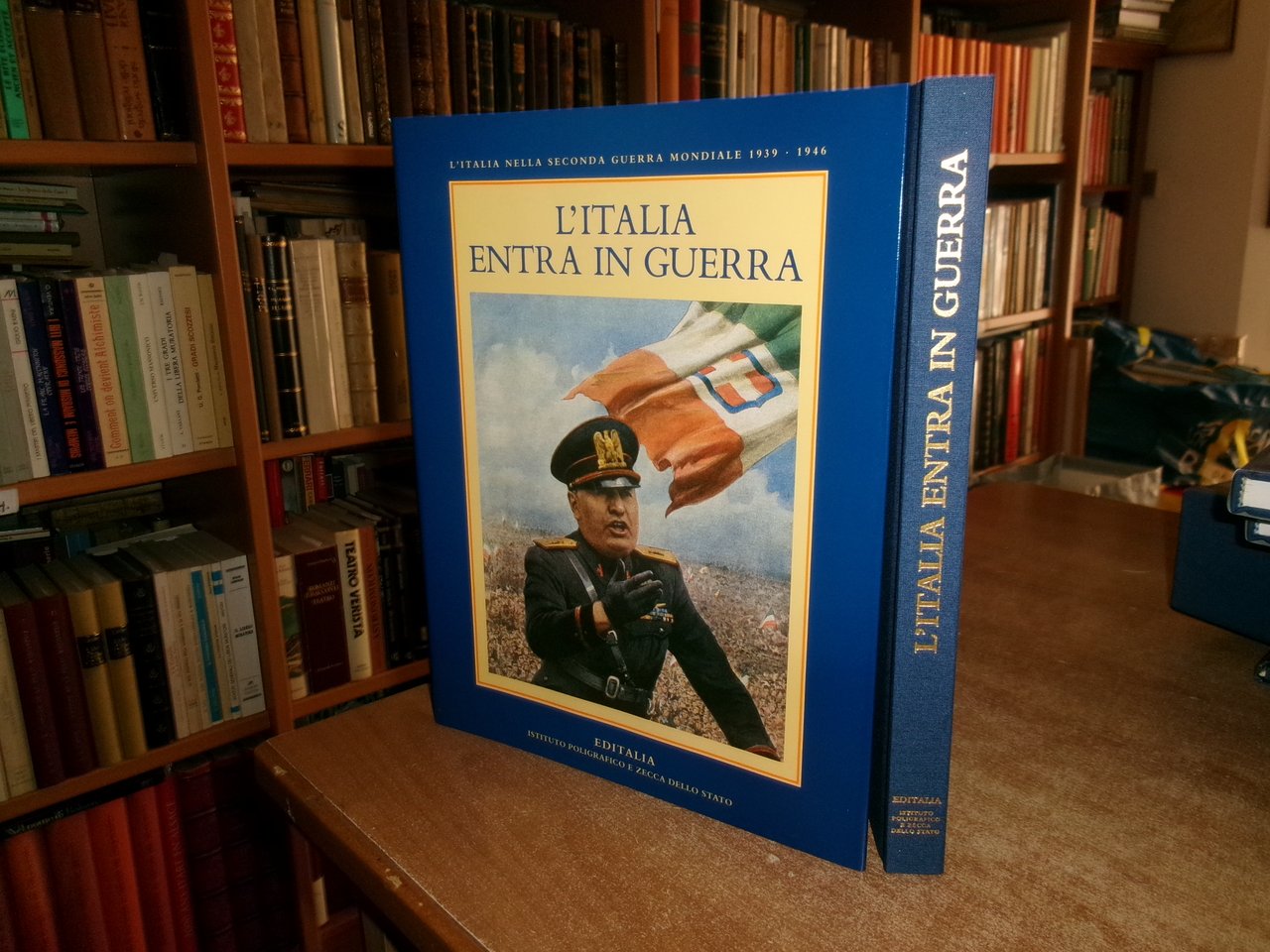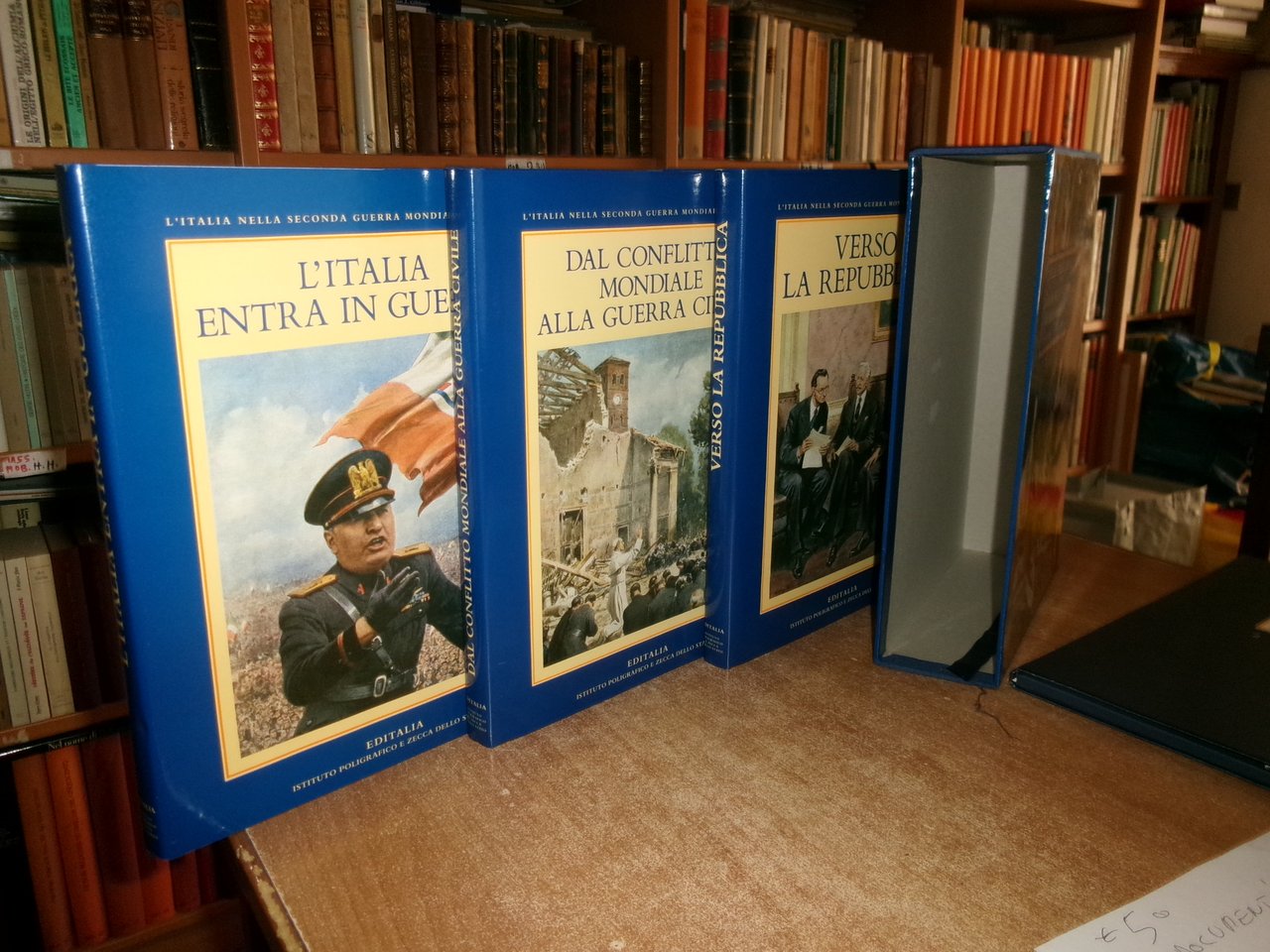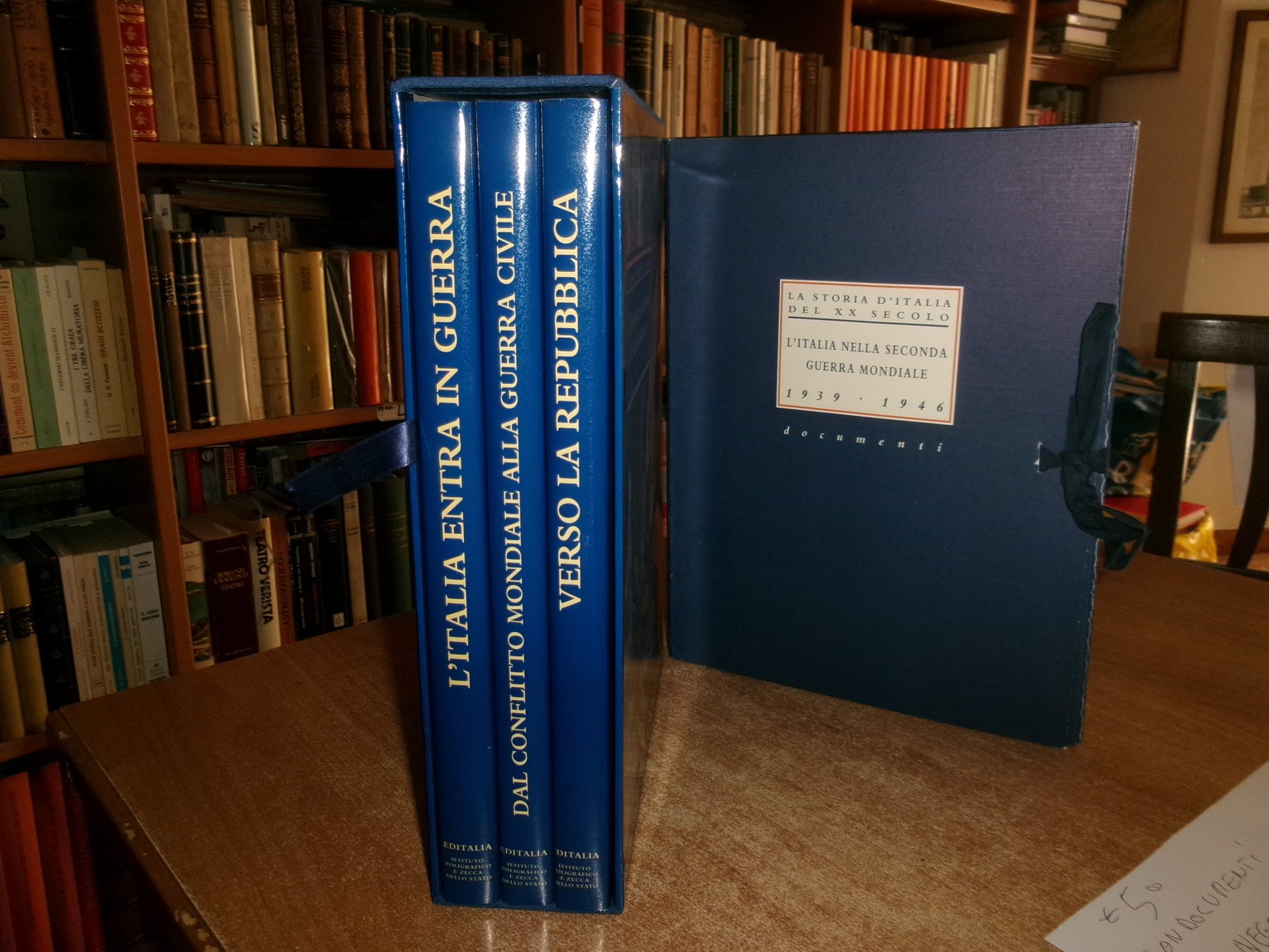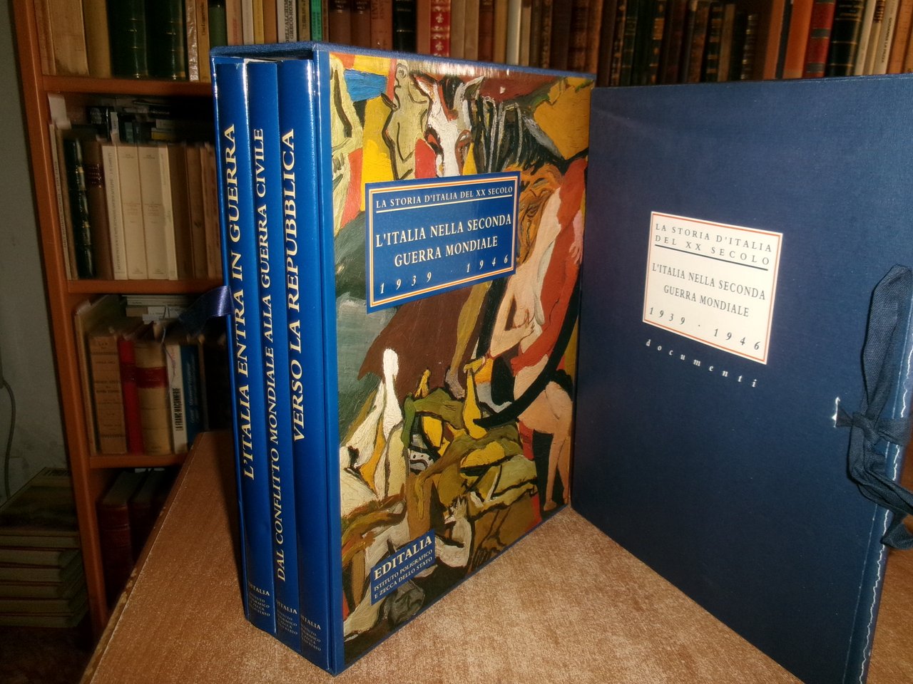 L' ITALIA NELLA SECONDA GUERRA MONDIALE 1939-1946 + documenti. Testi di Valerio Castronovo - Pietro Scoppola. Capitoli fotografici a cura di Alberto Maria Arpino - Giovanni Paoloni. Roma, EDITALIA Ist. Pol. E Zecca dello stato, 1997. 3 volumi in-4°, tela bleu edit. con titoli in oro e sovracopertine ill. a col. Vol. I. L' Italia entra in guerra. 190 pp.; Vol. II. Dal conflitto mondiale alla guerra civile. 168 pp.; Vol. III. Verso la Repubblica. 168 pp. I tre volumi sono corredati da innumerevoli immagini a colori e in bianco e nero n.t. + una cartella contenente 24 documenti riprodotti. Come nuovo nel cofanetto in m-tela. Neg. sport. storia.