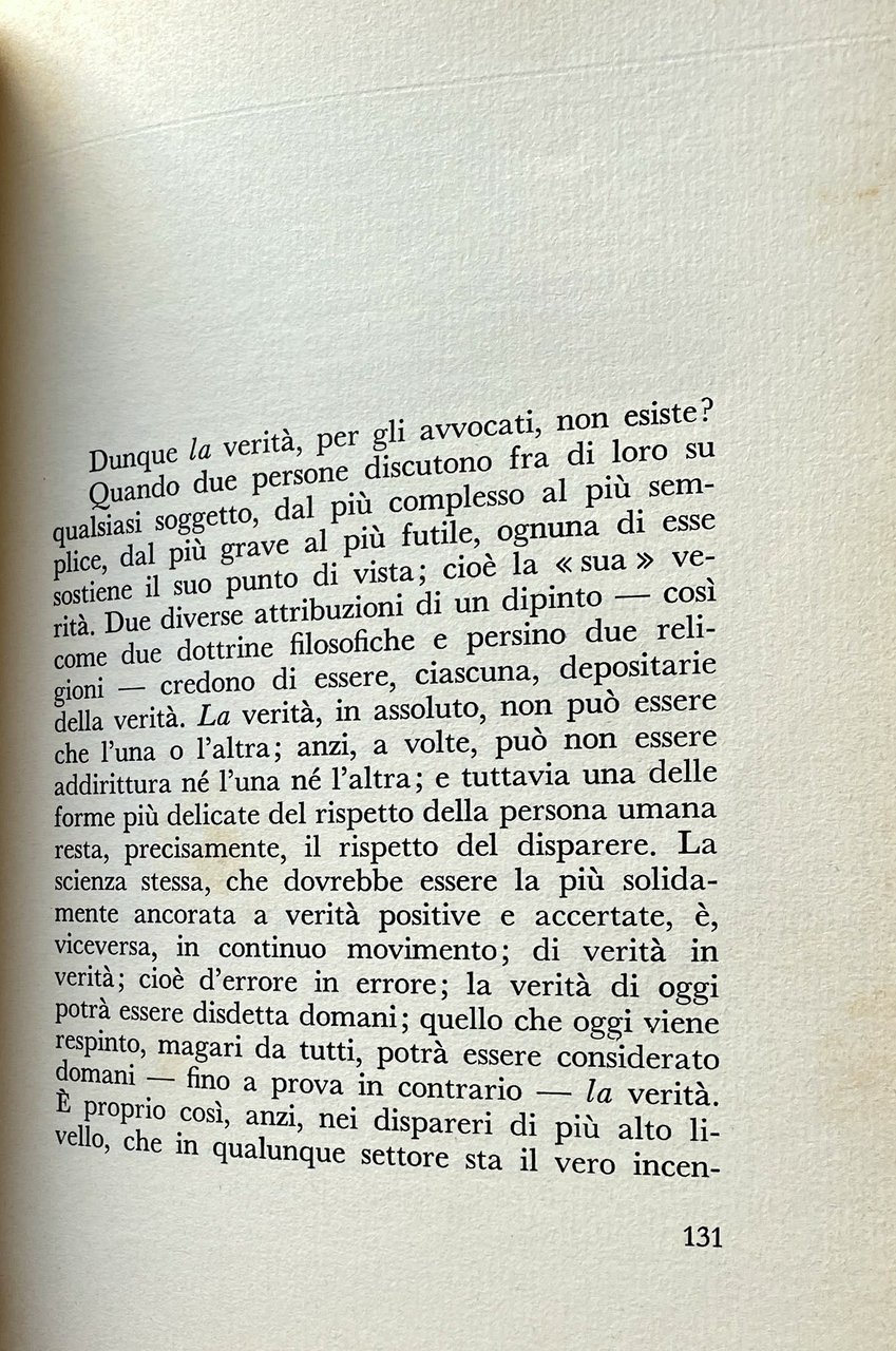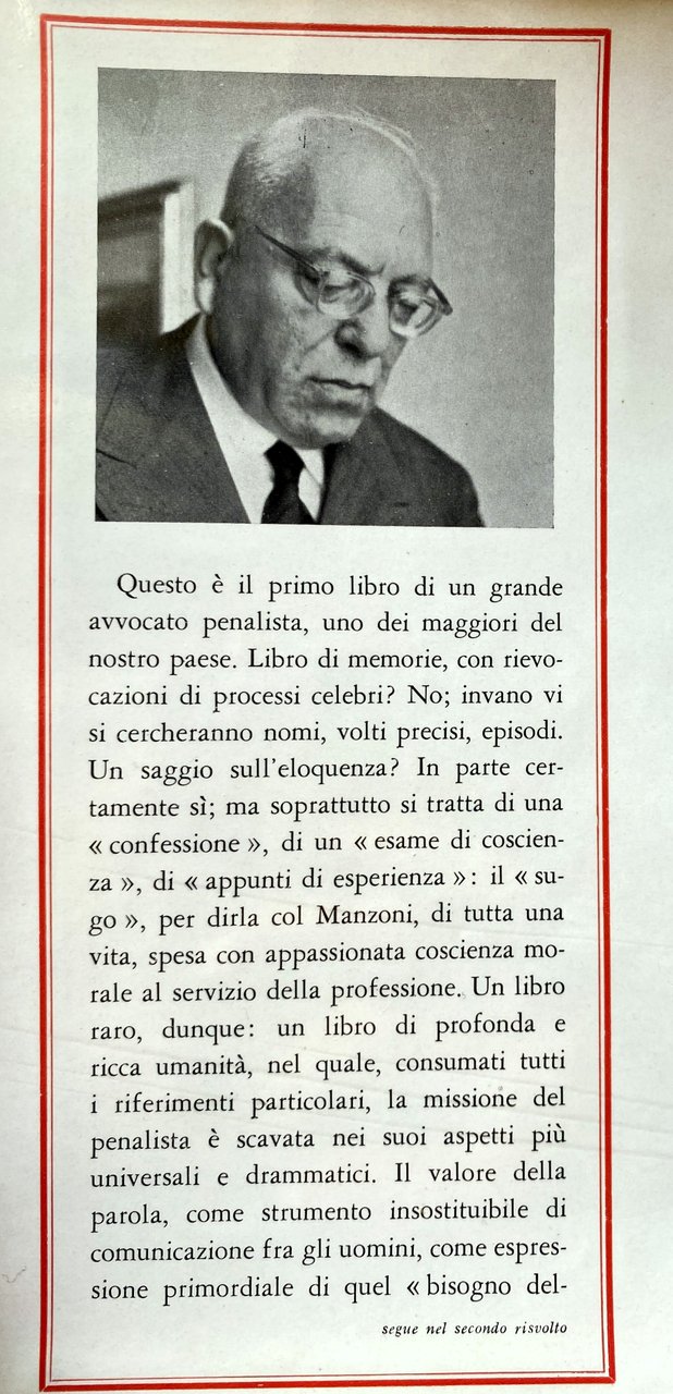 Soggetti: Giurisprudenza, Diritto penale, Avvocatura, Avvocati penalisti, Giusto processo, Testimonianze, Biografie, Memorie, Filosofia, Approccio deontologico, Deontologia professionale, Segreto, Giustizia, Verità, Difesa, Anni Sessanta, Collezionismo, Libri rari Vintage fuori catalogo, Sentenze, Giudice, Magistratura, Parti, Confessione, Eloquenza, Oratoria, Retorica, Arringa, Cultura giuridica italiana, Racconti, Letteratura, Narrativa, Romanzi biografici, Assoluzione, Condanna, Ergastolo, Diritti umani, Pregiudizio, Prove, Prova contraria, Criminali, Criminalità, Reati, Pene, Reclusione, Carcere, Libertà, Innocenza, Presunzione, Brocardi, Legge, Leggi, Legislazione, Politica giudiziaria, Colpevole, Errori giudiziari, Formule, Imputato Colpevoli Delitti Imputato Menzogna Causa Saggistica Civile Amministrativo Fascismo Costituzionale Romano Internazionale Lezioni Privato Pubblico Stato Gradi Cassazione Parola Idea Giudizio Ricorso Arringhe penali Coscienza Oratore Discorso Forense Inconscio Aula Tribunale Miracolo Parlare in pubblico Personalità Preparazione Documenti Segreti di mestiere Toga Uomini Eloquenza Voce Equilibrio Equidistanza Accademici Onorari Atti processuali Critica Metodo Vecchie generazioni Novecento Morale Etica Jurisprudence, Criminal law, Advocacy, Criminal lawyers, Due process, Testimonies, Biographies, Memoirs, Philosophy, Deontological approach, Professional ethics, Secrecy, Justice, Truth, Defense, Sixties, Collecting, Rare books out of print, Sentences, Judge, Judiciary, Parts, Confession, Eloquence, Oratory, Rhetoric, Speech, Italian legal culture, Stories, Literature, Fiction, Biographical novels, Absolution, Conviction, Life imprisonment, Human rights, Prejudice, Evidence, Criminals, Criminality, Crimes, Penalties, Imprisonment, Prison, Freedom, Innocence, Presumption, Law, Legislation, Judicial Policy, Guilty, Judicial errors, Formulas, Defendant Guilty Crimes Defendant Lie Cause Essays Civil Administrative Roman Constitutional Fascism International Lessons Private Public State Degrees Cassation Word Judgment Appeal Criminal arguments Conscience Orator Forensic Speech Unconscious Courtroom Miracle Public speaking Personality Preparation Documents Professional secrets Eloquence Voice Balance Equidistance Academics Honors Procedural documents Criticism Method Old generations Twentieth century