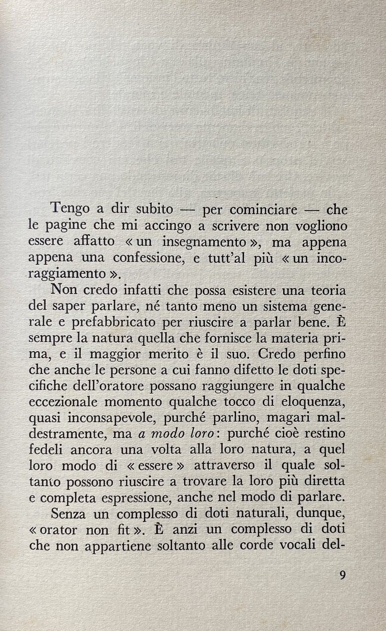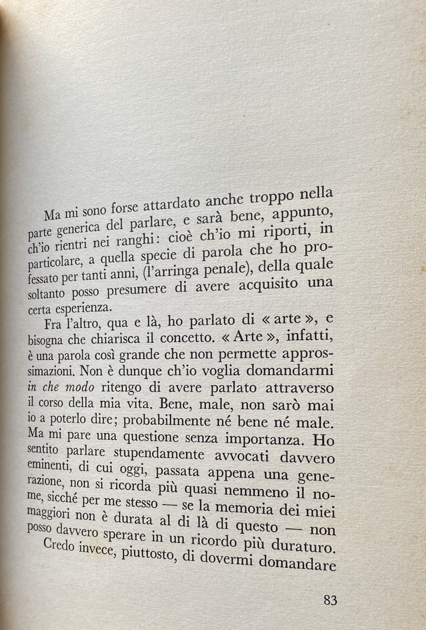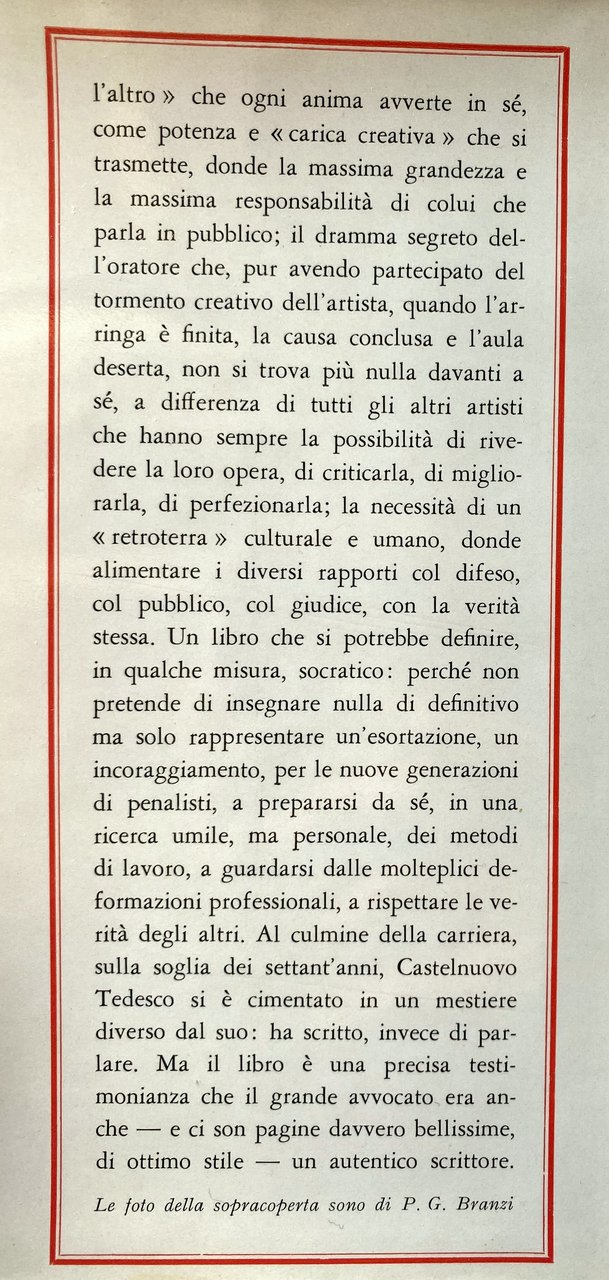 Questo è il primo libro di un grande avvocato penalista, uno dei maggiori del nostro paese. Libro di memorie, con rievocazioni di processi celebri? No; invano vi si cercheranno nomi, volti precisi, episodi. Un saggio sull'eloquenza? In parte certamente sì; ma soprattutto si tratta di una confessione, di un esame di coscienza, di appunti di esperienza: il sugo, per dirla col Manzoni, di tutta una vita, spesa con appassionata coscienza morale al servizio della professione. Un libro raro, dunque: un libro di profonda e ricca umanità, nel quale, consumati tutti i riferimenti particolari, la missione del penalista è scavata nei suoi aspetti più universali e drammatici. Il valore della parola, come strumento insostituibile di comunicazione fra gli uomini, come espressione primordiale di quel bisogno dell'altro che ogni anima avverte in sé, come potenza e carica creativa che si trasmette, donde la massima grandezza e la massima responsabilità di colui che parla in pubblico; il dramma segreto dell'oratore che, pur avendo partecipato del tormento creativo dell'artista, quando l'arringa è finita, la causa conclusa e l'aula deserta, non si trova più nulla davanti a sé, a differenza di tutti gli altri artisti che hanno sempre la possibilità di rivedere la loro opera, di criticarla, di migliorarla, di perfezionarla; la necessità di un retroterra culturale e umano, donde alimentare i diversi rapporti col difeso, col pubblico, col giudice, con la verità stessa. Un libro che si potrebbe definire, in qualche misura, socratico: perché non pretende di insegnare nulla di definitivo ma solo rappresentare un'esortazione, un incoraggiamento, per le nuove generazioni di penalisti, a prepararsi da sé, in una ricerca umile, ma personale, dei metodi di lavoro, a guardarsi dalle molteplici deformazioni professionali, a rispettare le verità degli altri. Al culmine della carriera, sulla soglia dei settant'anni, Castelnuovo Tedesco si è cimentato in un mestiere diverso dal suo: ha scritto, invece di parlare. Ma il libro è una precisa testimonianza che il grande avvocato era anche e ci son pagine davvero bellissime, di ottimo stile un autentico scrittore.