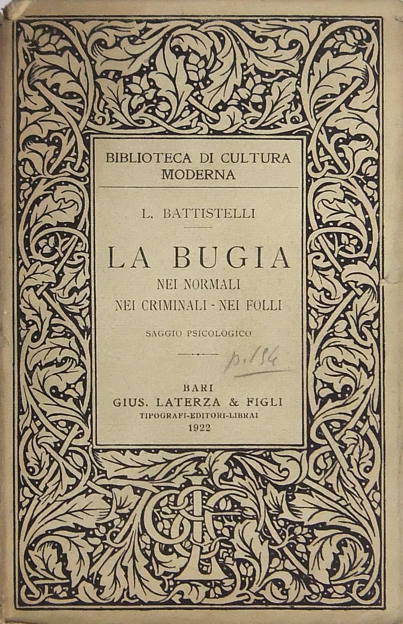 La bugia. Nei normali nei criminali nei folli. Saggio psicologico. Con introduzione del Prof. M. L. Patrizi | Libri antichi e moderni | Battistelli Luigi