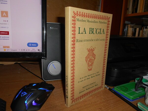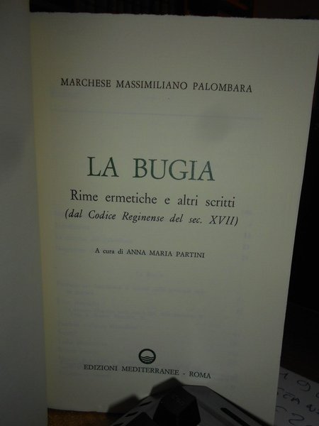 Marchese Massimiliano Palombara. Roma, Edizioni Mediterranee, 1983. LA BUGIA. Rime ermetiche e altri scritti. Da un Codice Regimense del sec. XVII. A cura di Anna Maria Partini. In-8°, cartoncino edit. con risvolti. 188 pp. con alcune ill. in nero n.t. Come nuovo. Uff. stanzetta mob. a sinistra sotto finestra
