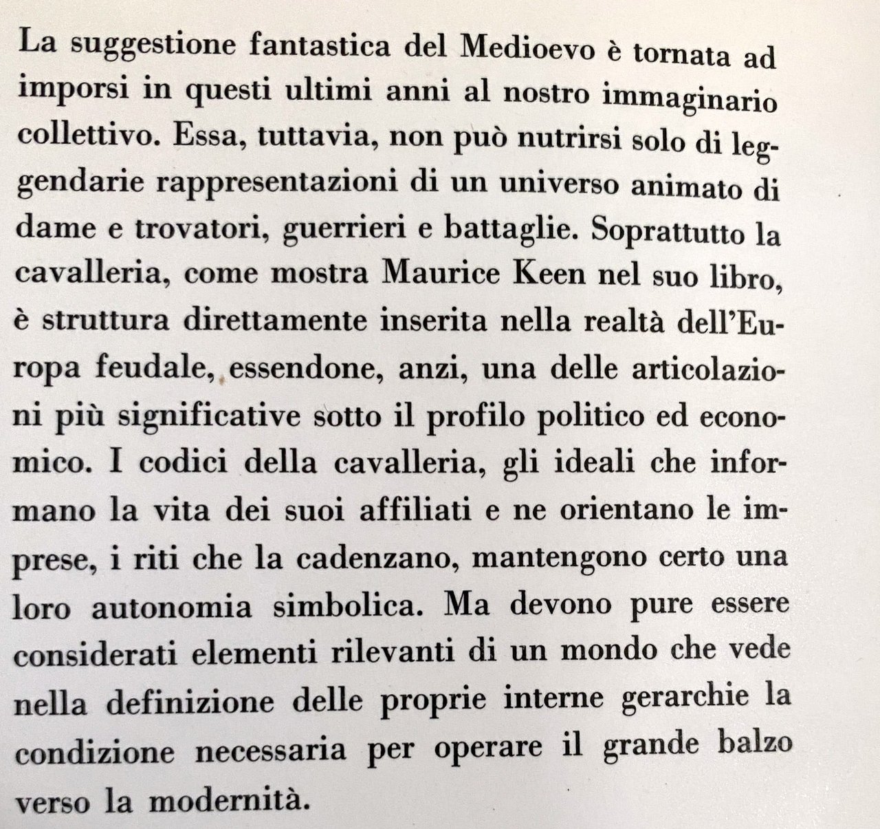 La suggestione fantastica del Medioevo è tornata ad imporsi in questi ultimi anni al nostro immaginario collettivo. Essa, tuttavia, non può nutrirsi solo di leggendarie rappresentazioni di un universo animato di dame e trovatori, guerrieri e battaglie. Soprattutto la cavalleria, come mostra Maurice Keen nel suo libro, è struttura direttamente inserita nella realtà dell'Europa feudale, essendone, anzi, una delle articolazioni più significative sotto il profilo politico ed economico. I codici della cavalleria, gli ideali che informano la vita dei suoi affiliati e ne orientano le imprese, i riti che la cadenzano, mantengono certo una loro autonomia simbolica. Ma devono pure essere considerati elementi rilevanti di un mondo che vede nella definizione delle proprie interne gerarchie la condizione necessaria per operare il grande balzo verso la modernità.