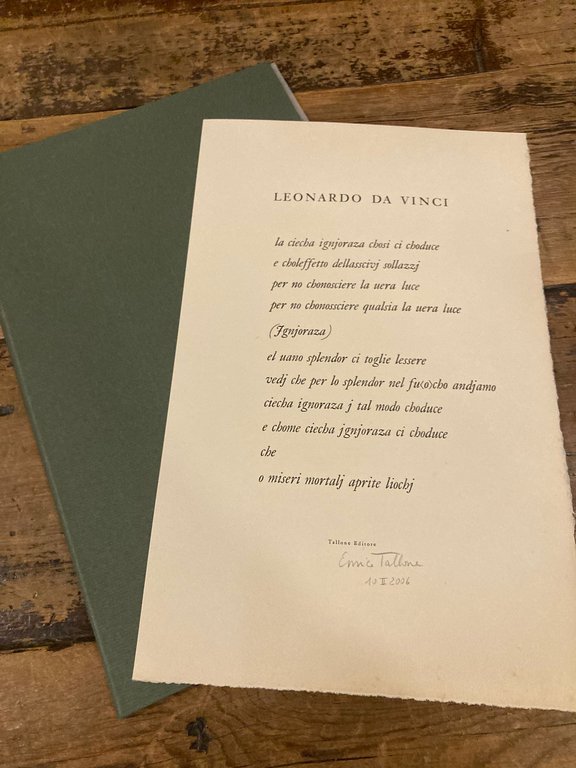 Foglio in-4° (29x18 cm) entro velina conservato in cartella editoriale in cartone rigido verde muto. Ottimo esemplare (tiratura di 50 copie, la presente la n° 3/4 su carta d' Arches antica) con firma a lapis di Enrico Tallone in calce al componimento. Edizione composta a mano da Tallone con i tipi barocchi originali .in occasione dell'esposizione 'Leonardo da Vinci - Capolavori in mostra' Torino, Biblioteca Reale, 10 febbraio - 19 marzo 2006