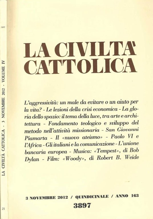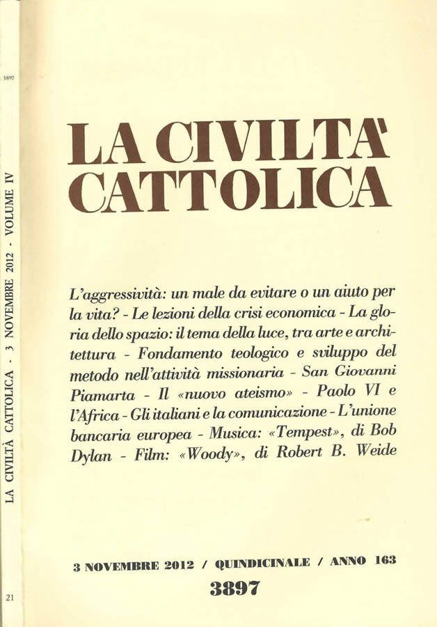 Rivista quindicinale di cultura, n. 21 - anno 163 - vol. IV - quaderno 3897 - 3 Novembre 2012. N. pag. 318. Brossura editoriale, copertina segnata da lievi tracce da manipolazione e compressione ai piatti, leggero bordo davanti sgualcito, alonati da minima polvere i toni, piccole fioriture ai preliminari, carte avorio ben tenute lievemente ondulate, tagli puliti.