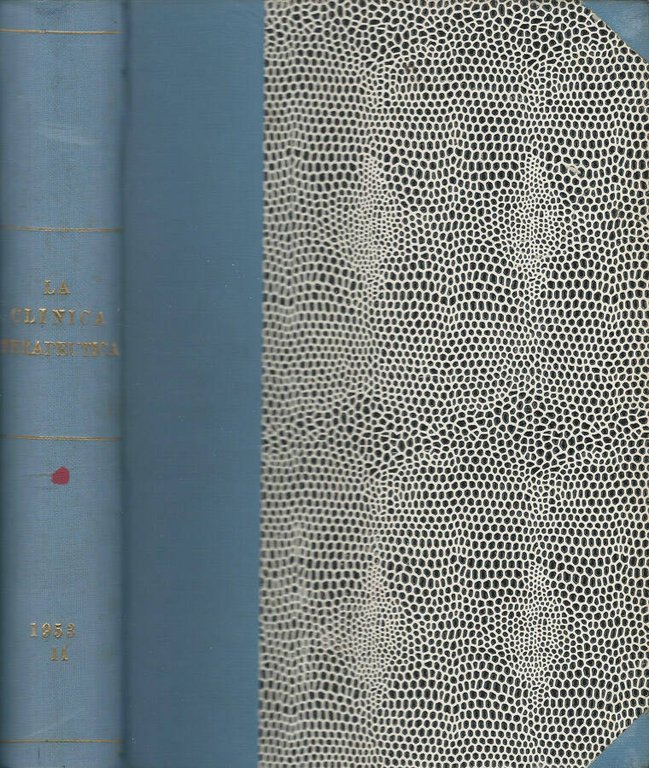 Rassegna mensile di terapia medica diretta da Mariano Messini, vol. 5, dal fascicolo I del luglio 1953 al numero 6 del dicembre dello stesso anno. Mezza legatura con angoli in tela celeste e piatti marmorizzati con lievi bruniture e piccola macchia di inchiostro rosso al dorso: pagine ingiallite, ben salde, leggermente ingiallite, con figure e tabelle e con sottolineature a pastello rosso e blu e con scotch al margine interno della pagina 543. Due diversi timbri di appartenenza al foglio di guardia anteriore, firma di appartenenza ad inchiostro celeste ad inizio fascicolo 6. Numero pagine 658.