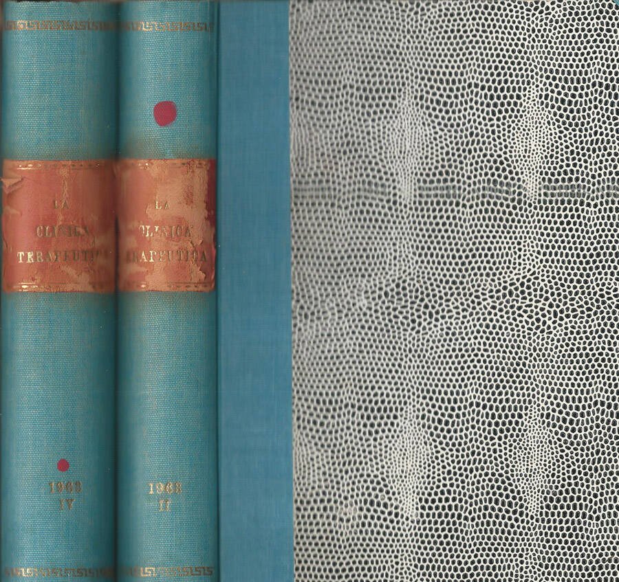 Annata incompleta della rassegna quindicinale di terapia medica diretta da Mariano Messini in due volumi, rispettivamente il numero 25, dal fascicolo I del 15 aprile al fascicolo del 30 giugno dello stesso anno ed il numero 27, dal fascicolo I del 15 ottobre 1963 al numero 6 del 31 dicembre dello stesso anno. Mezza legatura con angoli in tela azzurra e piatti marmorizzati, con titoli in oro solo al dorso all'interno di tassello in pelle rossa ormai sbiadita ed abrasa. Pagine ben conservate, con cerniera salda e numerose figure e tabelle, nel testo e fuori testo. Timbro alla prima pagina del volume 27. Numero pagine 588- 761.