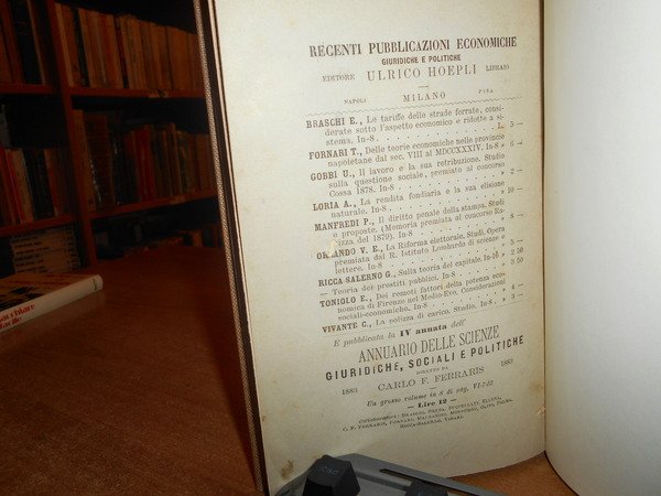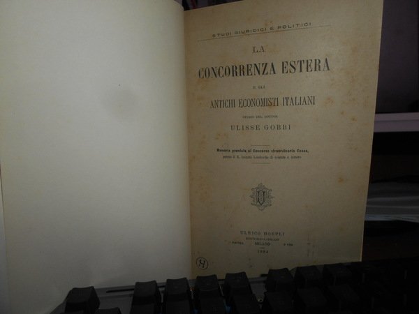 Studio del Dottor ULISSE GOBBI. Milano, Ulrico Hoepli, 1884. La concorrenza estera e gli antichi economisti italiani. In-8° piccolo, tela con titolo in oro entro tassello al dorso, copertine originali conservate. xvi, 309 pp. Ottimo esemplare in legatura recente con le brossure originali conservate. Neg. mob. bianco sopra cas