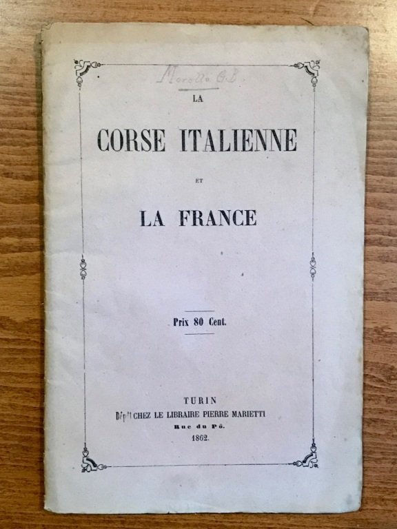 <span style="font-style: normal;">In-8° (cm. 20,8), brossura editoriale rosa a stampa (antica firma di appartenenza al contropiatto), pp. 32 in ottimo stato, 1 grande mappa d'Italia di Cesare Maggi con annessa la Corsica (carta pensata per la </span><i>Geografia</i> dello Schiaparelli); sporadiche fioriture. Edizione originale dell'opuscolo del capitano corso nato a Bocognano, fautore dell'annessione dell'isola al Regno d'Italia, morto poco dopo questa pubblicazione, si dice avvelenato. Ottimo esemplare. (SD6)