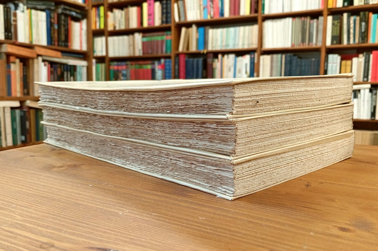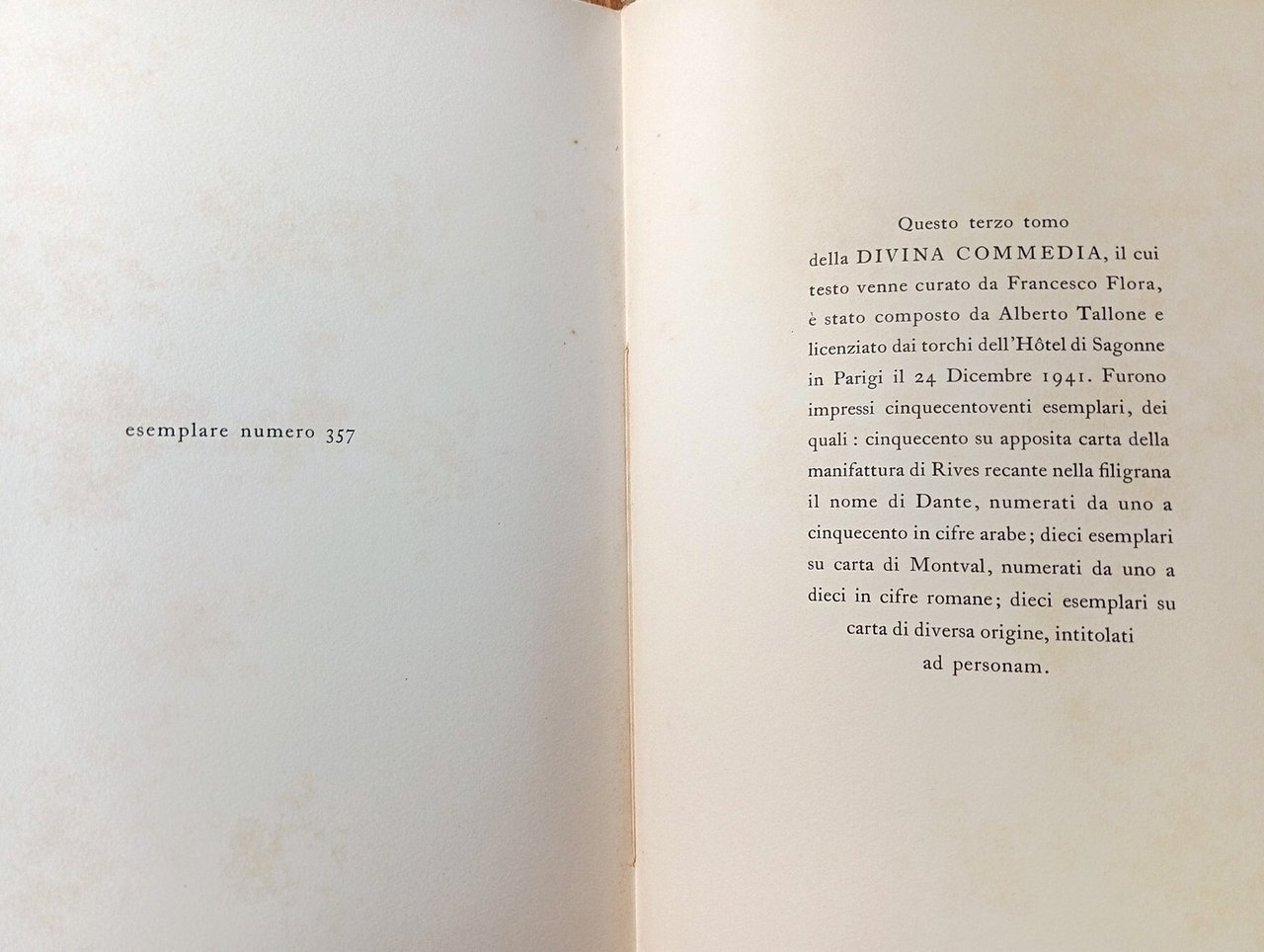 Edizione di 520 esemplari, di cui 500 stampati su carta Rives numerati 1-500, 10 su carta di Montval numerati I-X, 10 su carte diverse intitolati ad personam; il nostro fa parte della prima tiratura ed è il n. 357 - Opera completa di tre volumi di 21x32 cm circa, rilegatura editoriale in brossura con sovraccoperta e velina protettiva incamiciate, 220 + 226 + 223 pagine. Vol. I: Inferno - Vol. II: Purgatorio - Vol. III: Paradiso. Testo a cura di Francesco Flora. Mancano le custodie. Veline brunite e lacerate al dorso, leggere fioriture alle carte - ancora intonse (ovvero a fogli chiusi) - concentrate perlopiù ai fogli di guardia, peraltro le veline hanno trattenuto i segni del tempo esterni, conservando l'opera in condizioni complessivamente ottime. Edizione rara e prestigiosa -- Si tratta della prima edizione licenziata da Tallone, che ne avrebbe realizzato in seguito delle ulteriori tirature tra il 1950 e il 1951 (350 esemplari), poi nel 1967-68 (700 esemplari); infine nel 2000 per cura di Francesco Mazzoni ("La Commedia di Dante secondo l'antica vulgata", in 436 esemplari).
