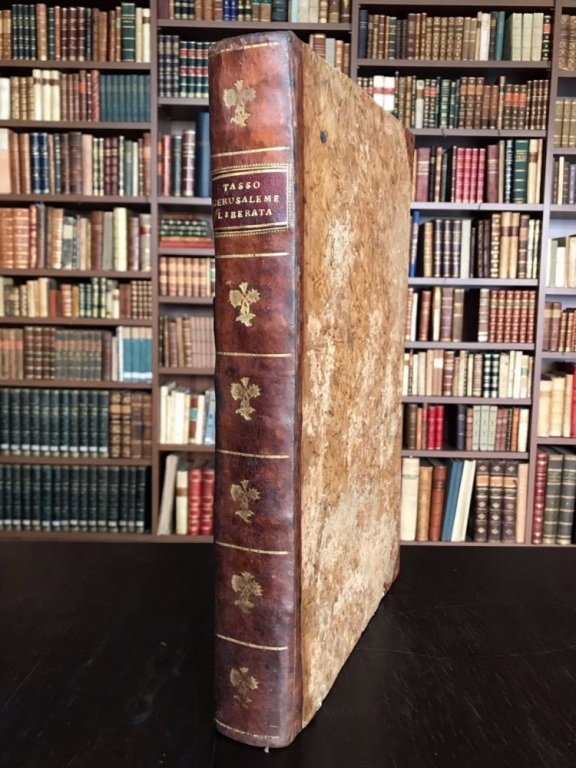 In-folio imperiale (cm. 42,8), legatura coeva in mezza pelle con fregi floreali in oro al dorso, titolo in oro su tassello marocchino (rinfrescata), tagli marmorizzati; 4 parti in un volume marginoso di pp. [16] 404 su carta greve e in ottimo stato, con molte testatine capilettera e finalini in xilografia; gora molto leggera al margine inferiore. Rara edizione in formato in-folio di un anno successiva alla prima (1772). «Galantissima e piacevole» [Serassi 563]. Cfr. Predari 372. Esemplare molto buono. (SG6)
