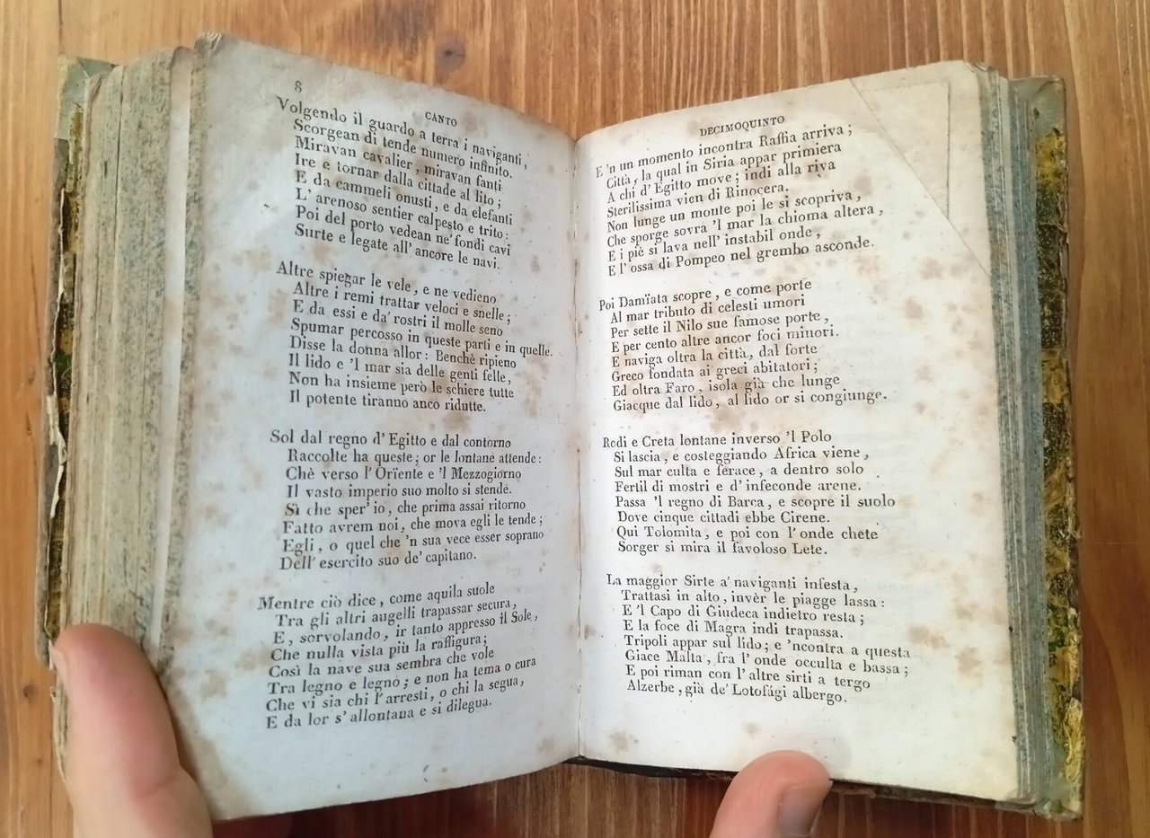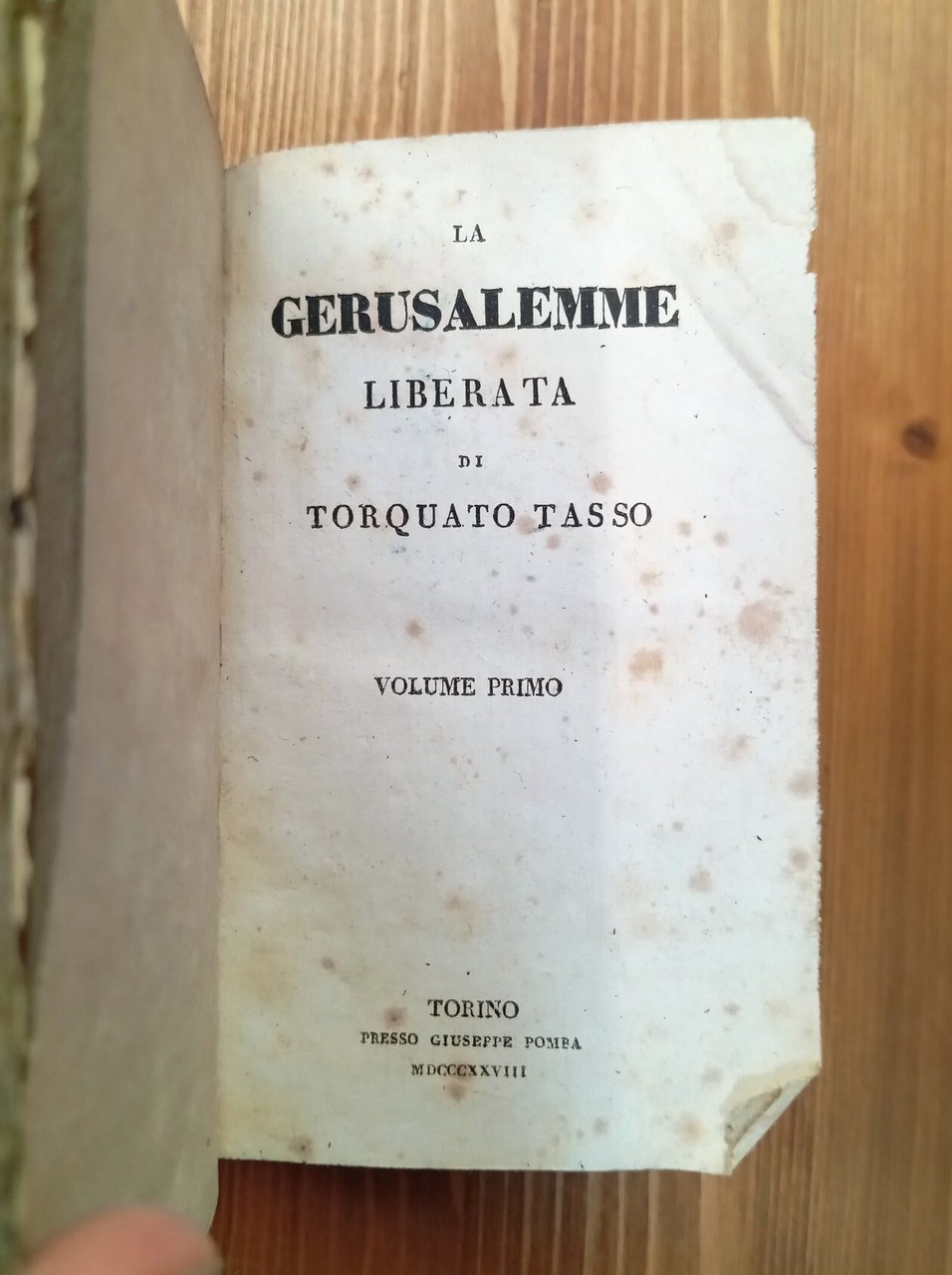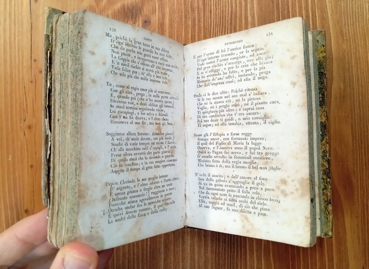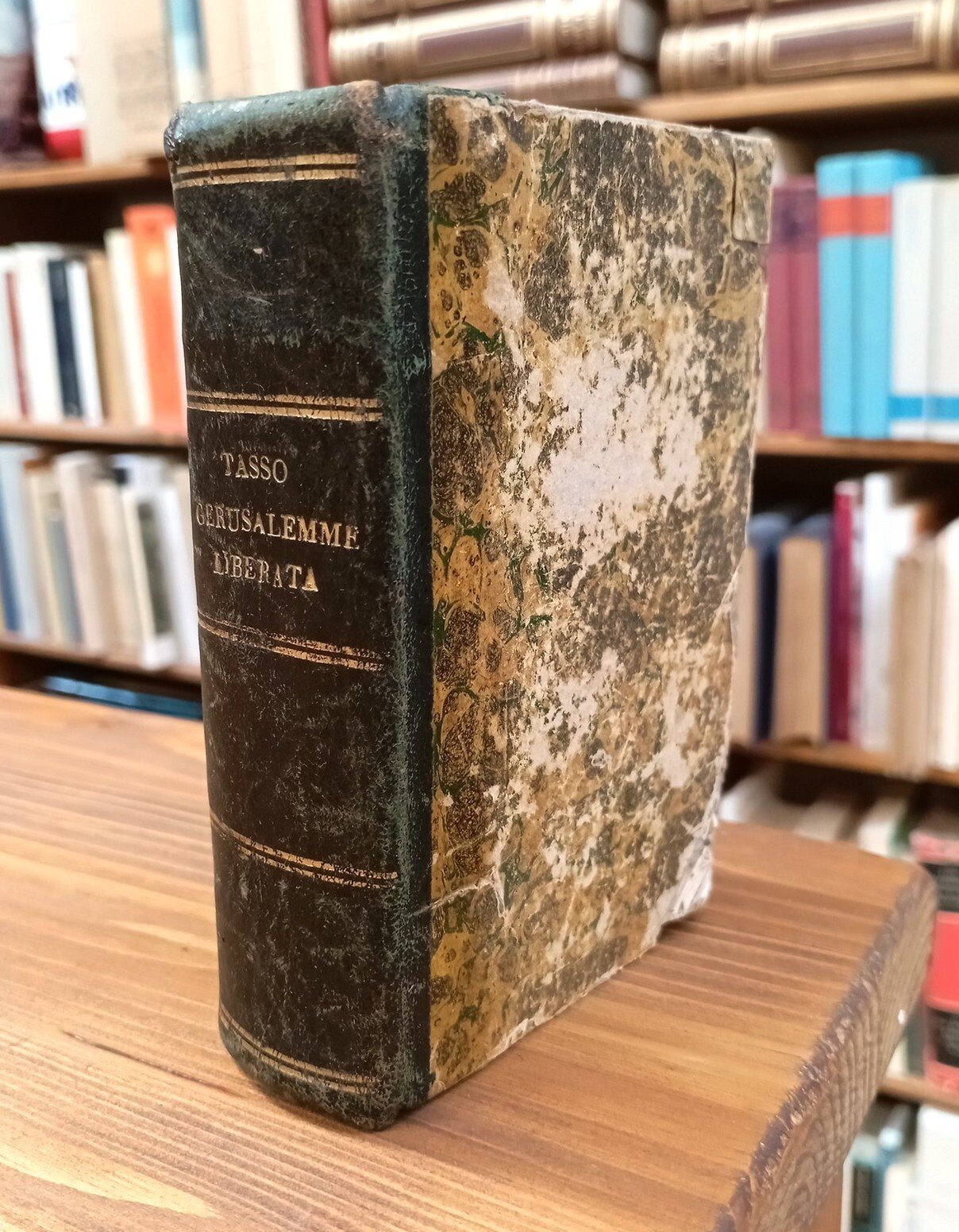 Opera completa di tre volumi rilegati in un unico tomo a mezza pelle verde con titolo in oro al dorso, 190 + 194 + 166 pagine. Alle pagine 5/8 del primo volume l'Editore illustra i criteri seguiti per il testo. Alle pagine 9/44 vi sono le Notizie intorno alla vita di Torquato Tasso. Lacuna all'angolo inferiore di copertina, fioriture alle carte; nel complesso esemplare più che accettabile, integro e fruibile, di una non comune edizione torinese del primo Ottocento -- In data I° novembre 1828 l'Editore Pomba diramò con un Annunzio tipografico la nascita di una Biblioteca popolare; fu l'iniziativa che meglio di ogni altra contribuì, almeno nell'ambito della Stato sardo a identificarlo con la figura ideale dell'editore moderno, coraggioso nel tentar nuove vie, tutto rivolto ai più larghi ceti dei lettori non danarosi ma assetati di cultura (dal "Catalogo delle edizioni Pomba e Utet").