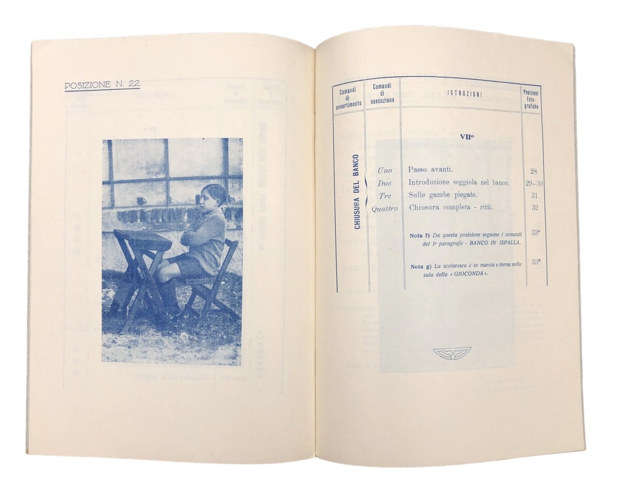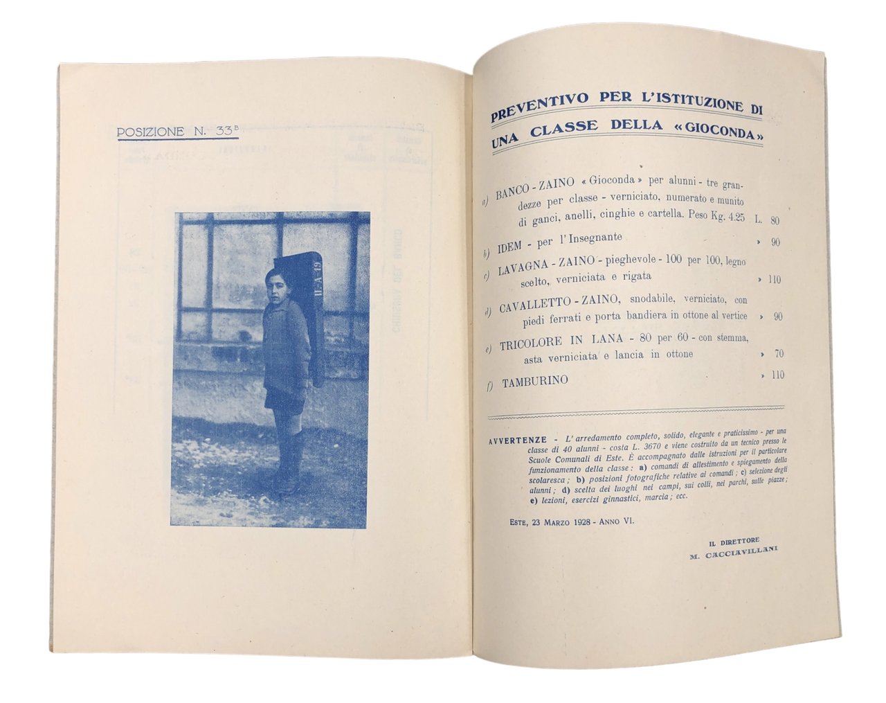 In-8° (cm. 23,5x17,1), pp. (21) con 6 FOTO virate in azzurro a piena pagina mostranti le varie posizioni del banco pieghevole e portatile a mo' di zainetto. Elegante brosssura in-8° (cm. 23,4x17,2), in cartoncino leggero azzurrino con titolo e raffigurazione delle mura di Este in azzurro, a risvolti. 2 cifre a penna in cop. Interno in bella carta liscia e distinta veste tipografica in carratteri blu. In fine, l'intraprendente Direttore ha steso un preventico per "l'istituzione di una classe della "Gioconda" in altre scuole. completo dei prezzi per il BANCO-ZAINO per alunni e Insegnante, LAVAGNA-ZAINO, entrambi pieghevoli, CAVALLETTO-ZAINO snodabile, verniciato, con piedi ferrati e porta bandiera , Tricolore in lana e TAMBURINO. Il tutto costruito da un tecnico delle Scuole Comunali di Este. Rarissimo, mai apparso.