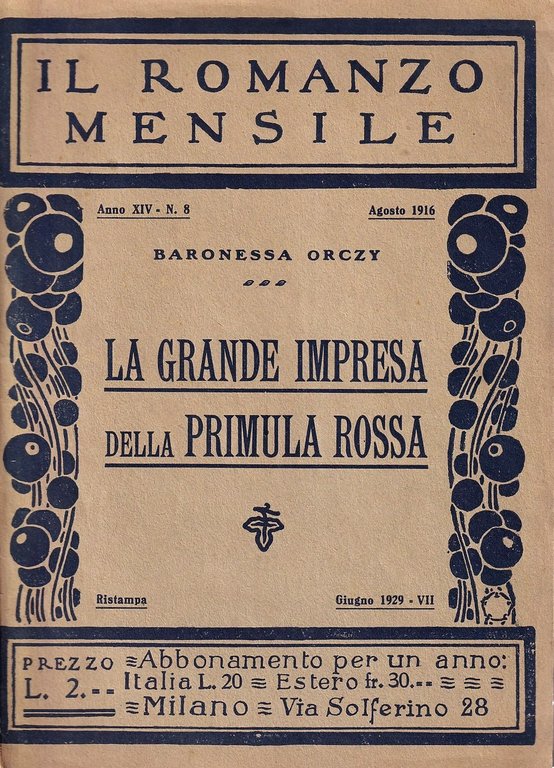Ristampa datata a giugno 1929 del numero di agosto 1916, anno XIV, n. 8 della rivista "Il romanzo mensile" del Corriere della Sera, con la traduzione italiana de "La grande impresa della Primula Rossa" della Baronessa Orczy, romanzo del ciclo 'La primula rossa' - Brossura editoriale con copertina illustrata a colori, 88 pagine con alcune illustrazioni in nero nel testo. Parziale lacuna al dorso, nel complesso copia ben conservata. SPEDIZIONE IN 24 ORE DALLA CONFERMA DELL'ORDINE.