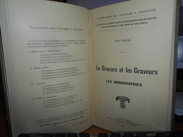 PAUL COLIN. Bruxelles, Librairie Nationale d' Art et d' Histoire, 1916 - 1918. LA GRAVURE ET LES GRAVEURS. Les Monographies. 2 volumi legati assieme in-8°, tela con titolo in oro entro tassello al dorso, copertine originali conservate. ix, 93, (6) pp.; vi, (1), 344, xi pp. Bell' esemplare. Neg. mob. 17