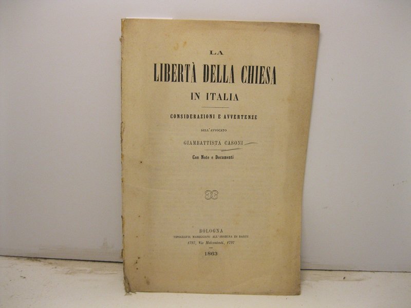 La liberta' della Chiesa in Italia. Considerazioni e avvertenze | Libri antichi e moderni | Casoni Giambattista