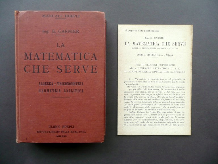 Ing. E. Garnier, La matematica che serve Algebra - trigonometria - geometria analitica con 133 figure e oltre 100 esempi, problemi ed applicazioni Hoepli, Milano 1930, cm 15,5x10,5, pp. XII; 522 con 133 fig. in b/n nel t., tutto cartonato ed. telato con titolo al dorso e al piatto ant.; tagli rossi. Frontespizio con nome del precedente proprietario annotato a penna. Accluso schedino ed., ben conservato. Condizioni di conservazione Esemplare in buone condizioni con tracce d'uso; angoli dei piatti con minimi difetti; dorso con lievi accenni d'ingiallimento e un paio di pressochè trascurabili strappetti alle cuffie. Interni buoni; poche pagine con un leggero segno o annotazione a matita al margine est. SETT115.L10971 N P