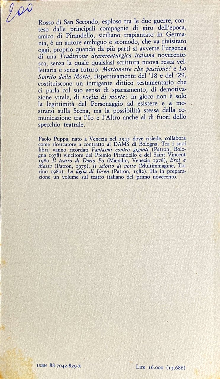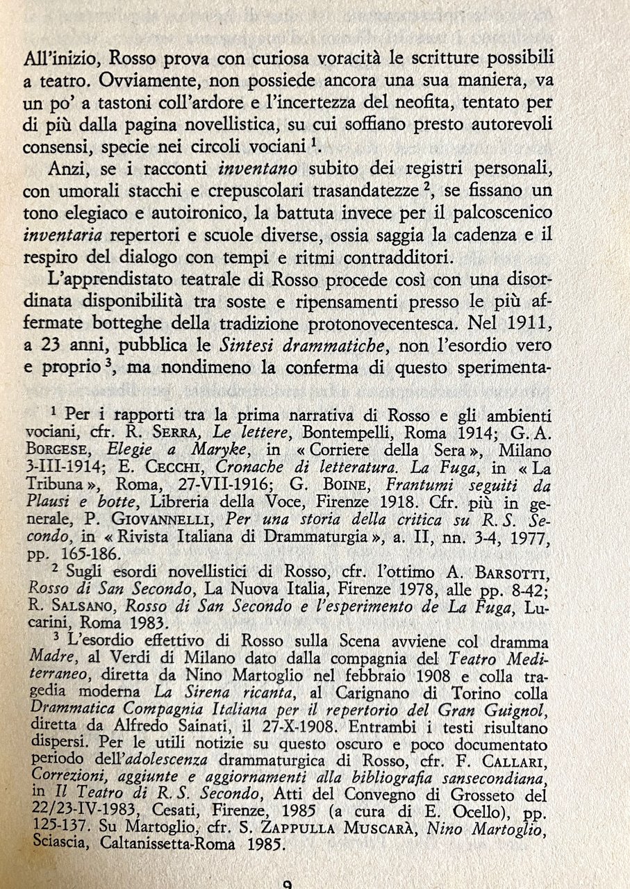 Soggetti: Critica letteraria Teatro Drammaturgia Testi teatrali Novecento Avanguardia Studi letterari Pier Maria Rosso di San Secondo 1887-1956 Spirito della morte La sirena ricanta Letteratura drammatica Metateatro Spettacolo Carlo Zagrù Smorfia Atti Autori italiani Novelle Sintesi drammatiche Germanistica Al di là Luigi Pirandello Surrealismo Luigi Ferrante Interpretation Death in literature Drama Italian 20th century Texts Puppets Passion Literary Studies Ruggero Jacobbi Bella addormentata Commedie Libri rari Vintage Farse Cafè-chantant Gabriele d'Annunzio Salvatore Di Giacomo Roberto Bracco Benedetto Croce Raffaele Viviani Maschere Fuori catalogo Classici Theater Dramaturgy Theatrical Twentieth Avant-garde Spirit Dramatic Show Grimace Acts Authors Novels Synthesis German Beyond Sleeping Beauty Comedies Rare Books Masks Out of print Classics Collectibles Collezionismo Espressionismo Mito Marionette Carnevale Maschera Expressionism Myth Carnival Mask Battute Borghese Camorengo Commedia Comedy Copione Coralità Erotismo Destino Dialogo Esistenziale Follia Ironico Camaiore Maternità Messa in scena Metafora Metateatrale Natura Anna Barsotti Parodia Personaggi Plutone Proserpina Rappresentazione Ratto Renato Cialente Sansecondiana Signora dalla volpe Lutto Pastrano Solitudine Spazio scenico Tatiana Pavlova