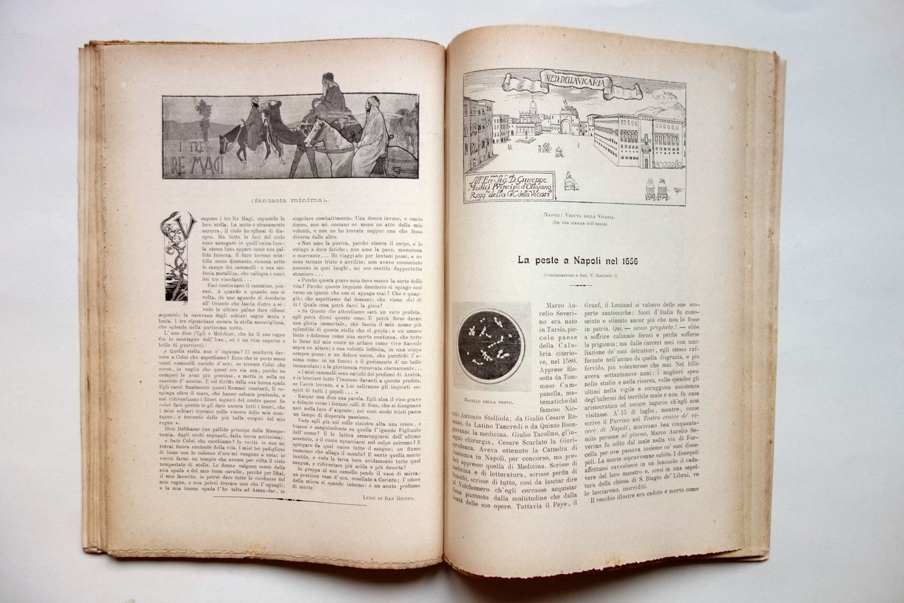 Rivista (due numeri), La Peste a Napoli nel 1656" articolo firmato S. Di Giacomo in "Natura e Arte" 1898 articolo completo, suddiviso in due numeri di rivista 2 numeri di rivista; senza dati tip. per mancanza della legatura, s. d. ma 1898; cm 29x20; pp. totali 176, con numerose ill. in b/n; l'articolo sopra citato è alle pp. 42-47 del primo numero e alle pp. 131-136 del secondo numero, corredato da alcune ill. in b/n. Due numeri uniti insieme, provenienti da rilegatura in volume, mancanti della copertina originale, completi del testo. Articolo completo. Condizioni di conservazione Esemplare in buone condizioni, proveniente da rilegatura in volume, mancante delle copertine originali; al dorso tracce della precedente rilegatura; alcune piccole lievi bruniture e aloni. Compatto ad eccezione delle pp. 1-14 del primo numero, quasi totalmente staccate. Per maggiori dettagli vedi foto. L'articolo sopra indicato è completo, suddiviso in due numeri di rivista. SETT4.L22280 N "