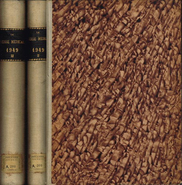 Anno 1949 incompleto, presenti i NN. dal 30, 7 maggio, all' 82, 31 dicembre, distribuiti in due tomi, anno 57.o del periodico La Press Médicale. Due volumi degli anni '40 del '900 in stato discreto, rilegati con coperta in mezzatela con angoli, piatti marmorizzati, sul dorso targhetta in tessuto con caratteri dorati in bassorilievo e talloncino in carta con catalogazione bibliotecaria, alcuni segni del tempo, tracce di fioritura sparsa, tagli leggermente ambrati, quello di testa di colore bordeaux, pagine in buono stato, alcune e margini poco ambrati, presenza di gora, due pagine con becca; Volume II con ultimo foglio di guardia con mancanza. Il rilegatore ha mantenurto all'interno dei volumi i piatti originali di alcuni fascicoli, in cartoncino patinato. Presentano talloncino in carta con catalogazione bibliotecaria su risguardia, timbro ex biblioteca su testate, testo posto su due e tre colonne, illustrazioni in b. e n. ed a colori, inserzioni pubblicitarie; N. 39, 15 giugno presenta Travaux originaux, su carta patinata, N. 61, 28 settembre è un Numéro de Mémoires, stampato su carta patinata, N. 65, otttobre è un numero speciale dedicato al "Centenaire de la Société Médicale des Hopitaux de Paris", 21-22 ottobre 1949, stampato su carta patinata, N. 82, 25 dicembre presenta coperta illustrata a colori in cartoncino patinato, anch'esso stampato su carta patinata. Numero Pagine 1437, numerazione delle pagine in sequenza tranne Indici