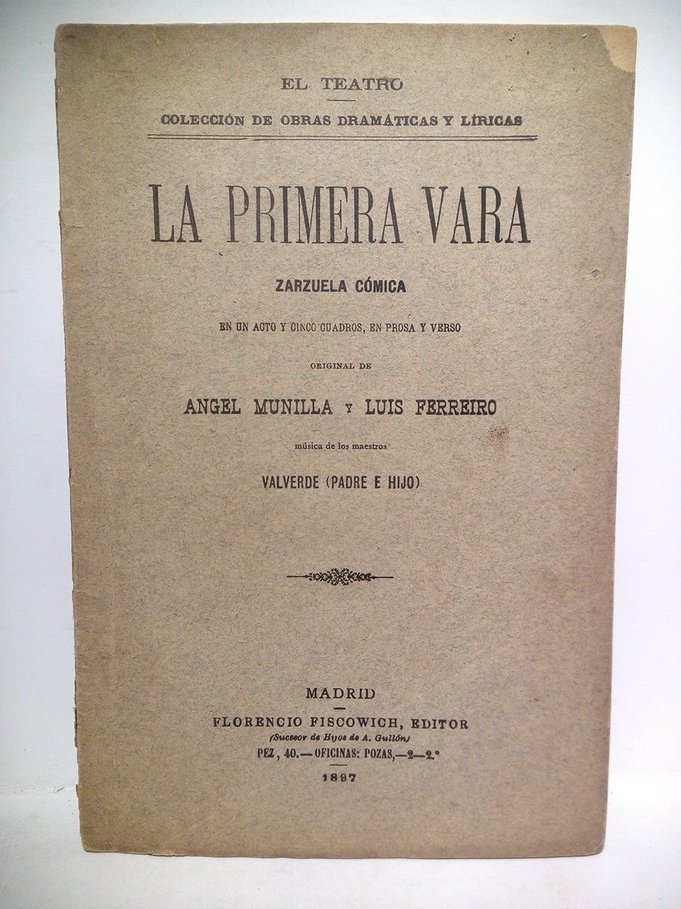[PRIMERA EDICION].- Madrid: Florencio Fiscowich, Edotor (R. Velasco, Imp.), 1897.- 40 p.; 4º menor (20,2 x 13,4 cm).- (El Teatro. Colección de Obras Dramáticas y Líricas).* La cubierta anterior falta de un pequeño trocito en su esquina superior externa. TEATRO LÍRICO, ÓPERA, ZARZUELA
