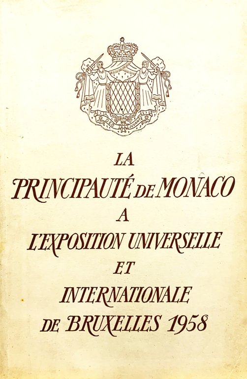 I ed.. Testo in francese. Catalogo relativo alla partecipazione del Principato di Monaco all'Exposition Universelle et Internationale de Bruxelles, 17 Avril-19 Octobre 1958. VIII/ 160/ brossura in cartoncino liscio avorio con titoli e grafica in marrone. Con illustrazioni in b/n (anche a carattere pubblicitario). Stato buono. Table des matières: Déclaration de S.A.S. le Prince Souverain - Déclaration du Baron Moens de Fernig - Généralités sur la partecipation de Monaco à l'Exposition - Déclaration de Son Exc. M. Henry Soum - Composition du Commisariat Général de la Section Monégasque - Déclaration de Son Exc. M. Jacques Reymond - Notice générale sur la Principauté - Le développement de la culture à Monaco, par S. Exc. M. Pierre Blanchy - L'urbanisme à Monaco, son évolution, ses réalisations présentes er futures, par M. Pierre-Victoir pène - Déclaration du Docteur Joseph Simon - Déclaration de M. le Maire Robert Boisson - Notice sur la Principauté - La Dynastie des Grimaldi, par M. Albert Lisimachio - Le Musèe Océonagraphique, par le Commandant Yves Cousteau - Le Musée d'Anthropologie Préhistorique, par M. Louis Barral - Les Jardins de la Principauté de Monaco, par M. Jean Le Graverend - Le Centre d'Acclimation Zoologique - Le Jardin Exotique, par M. Louis Vatrican - Le Bureau Hydrographique International - La Croix-Rouge Monégasque - Le Diocèse de Monaco, par Son Exc. Mgr. Gille Barthe - Monographie sur les timbres-poste de la Principauté - L'Opéra de Monte-Carlo - Le climat de la Principauté - Le Tourisme, par M. Gabriel Ollivier - L'hôtellerie monégasque et son avenir, par M, Amédée Crettaz - Radio Monte-Carlo, par M. Robert Schick - Télé Monte Carlo - L'aspect commercial et industriel de la Principaut>é, par M. Vincent Fautrier - Liste des Exposants - La vie littéraire, par Réné Novella - L'industrie textile, par Louis Pannassié - Déclaration de M. Charles Gamba - Principaux arbres et plantes du jardin du pavillon - Visite au Pavillon (Détail de l'illustration de l'histoire de la Dynastie - Détail de la présentation du Musée Océonagraphique - Détail de la présentation du Musée d'Anthropologie - Détail du panneau du timbre) - Louis Abbiate, par M. Alfred Romagnan-Chiabaut - Liste des grandes institutions et organisation internationales dont la Principauté fait partie - Quelque statisques (Mouvement touristique - Sur le plan éducatif; sur le plan économique - Sur le plan social).