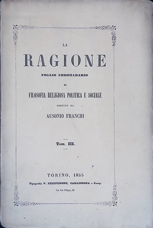 La ragione. Foglio ebdomadario di filosofia religiosa politica e sociale. Tomo III | Libri antichi e moderni | Franchi Ausonio (Direttore)
