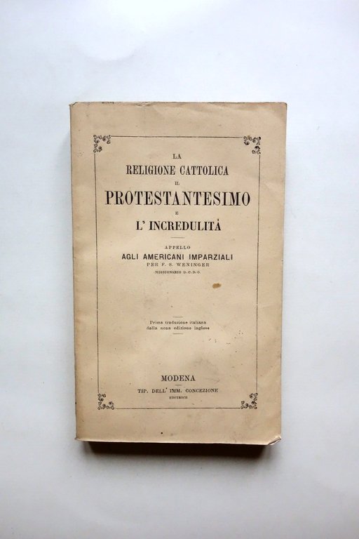 F. S. Weininger, La Religione Cattolica il Protestantesimo e l'Incredulità appello agli americani imparziali per F. S. Weininger missionario D. C. D. G. prima traduzione italiana dalla nona edizione inglese Tip. dell'Imm. Concezione, Modena, s. d, ma primo Novecento circa; cm 18x11; pp. VIII-304; brossura ed. Alla prima bianca timbro di biblioteca, esemplare regolarmente annullato. Condizioni di conservazione Buone condizioni con minimi segni del tempo, ancora intonso (mai sfogliato); minime tracce di sporco alla brossura. Interni buoni con qualche piccola brunitura. SETT194.L24395 N