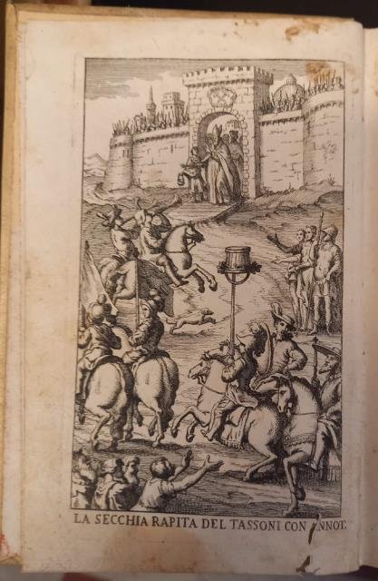 Cm.17x10,7. Pg.(12), XLVIII, 450, (6). Legatura coeva in piena pergamena rigida. Tassello cartaceo con titoli manoscritti al dorso. Tali spruzzati in rosso. Doppio ex libris applicato al foglio di guardia. Le prime 19 carte e le pg.1-7 sono interessate da minimo lavoro di tarlo ubicato solo mel margine bianco inferiore. Stemma di vecchia biblioteca privata al frontespizio, che presenta marca tipografica. Antiporta figurata e ritratto dell'autore inciso in ovale. Opera adorna di 12 incisioni di G. Filosi su disegni di G. Menescardi e G. Sradizzi, ubicate all'inizio di ciascuno dei 12 Canti. Dopo le dedicatorie compare un estratto della "Istoria della volgar poesia", vol.V, di Crescimbeni, e la "Vita di Alessandro Tassoni scritta da Lodovico Antonio Muratori. In fine al testo "Primo Canto dell'Oceano del medesimo autore. Con la copia d'una Lettera scritta ad un Amico, sopra la materia del Mondo Nuovo", "Varie lezioni de' due manuscritti originali: l'uno della Biblioteca Estense; e l'altro de' Conservatori della Comunità di Modena", e il Catalogo delle edizioni del Bettinelli. Prima edizione del capolavoro del Tassoni impressa dal Bettinelli. Nella maggioranza dei casi l'opera non presenta le 12 tavole all'incipit dei vari Canti, invece presenti di sovente nelle successive edizioni 1742, 1747 e 1763, come parzialmente segnalato in SBN con l'indicazione "Variante B". > Puliatti, 125. Morazzoni, 256. Graesse, VII, 40. ICCU\TO0E\004830, "Var. B: tavole calc. di G. Menescardi e G. Filosi all'inizio dei canti 3, 4, 5, 6, 9, 11". Codice libreria 162082.