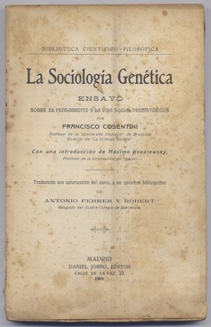 La Sociología Genética. Ensayo sobre el pensamiento y la vida social prehistóricas. Con una Introducción de Máximo Kovalewsky. Traducción y Apéndice bibliográfico de Antonio Ferrer y Robert. | Libri antichi e moderni | Cosentini, Francesco (1870-1944).