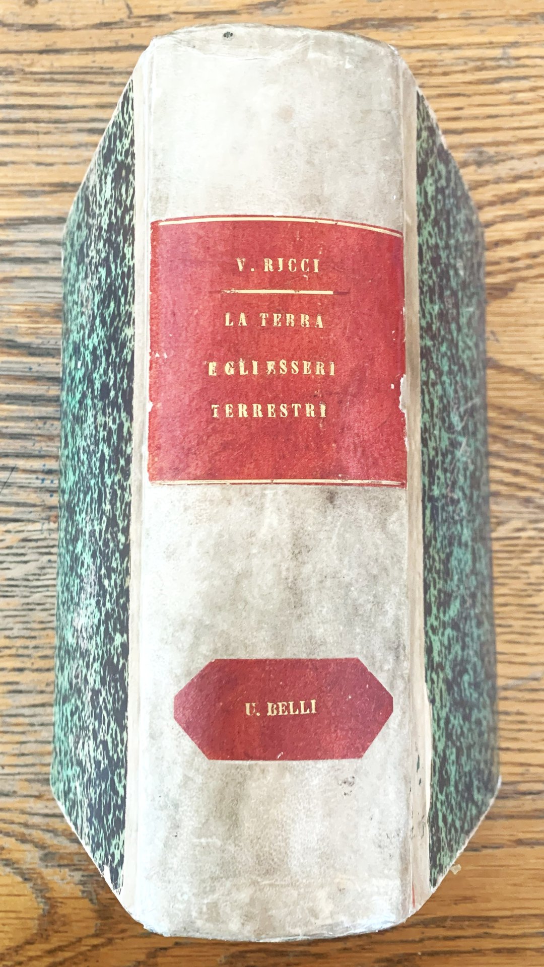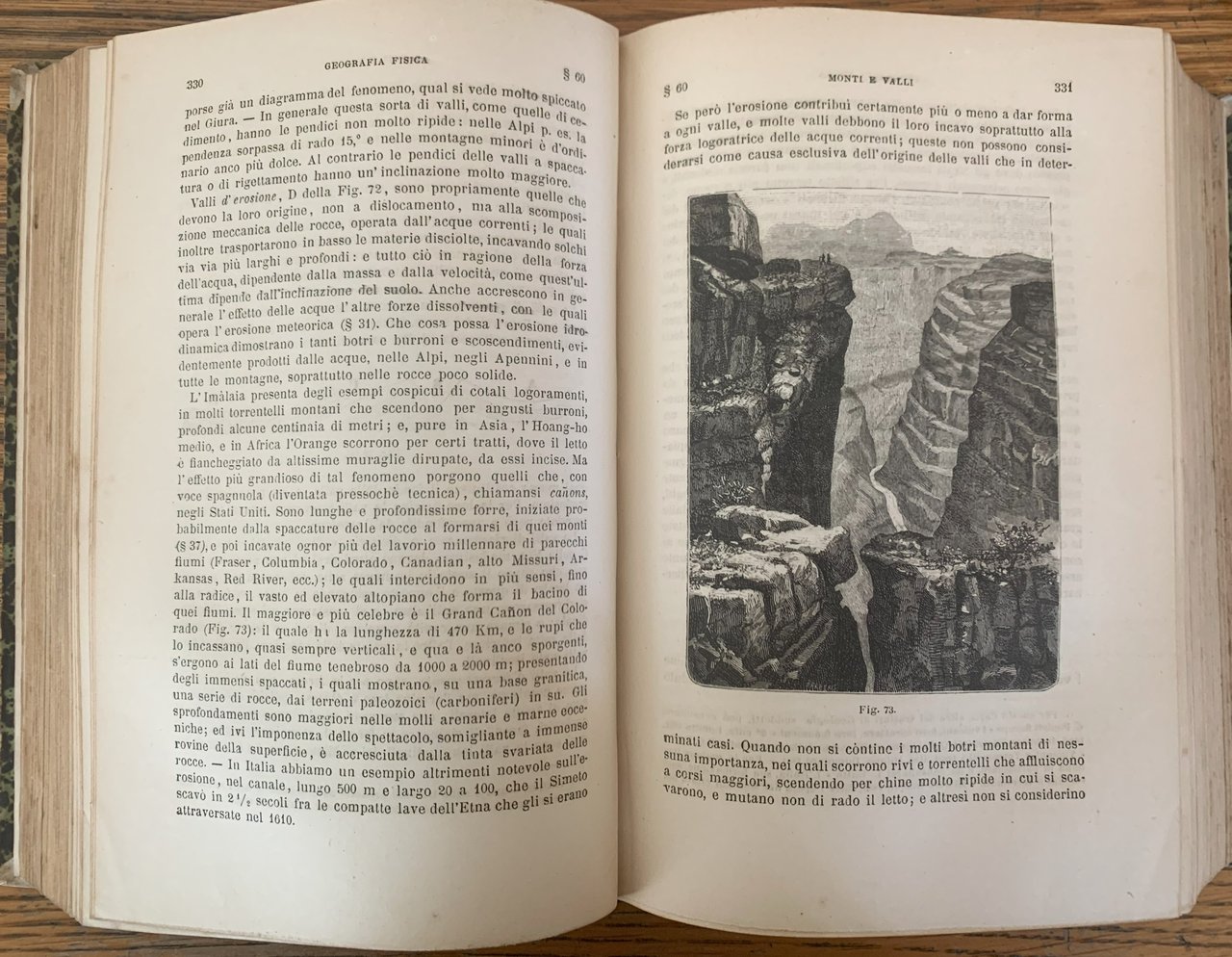 I ed. In-8, pp. XVI+1088, riletura in mezzapelle beige con titoli color oro al dorso caselle rosse e pitti effetto marmorizzato (marmo verde di prato/ serpentino). Con illustrazioni e tabelle in nero. Stato buono-discreto (leggero stato d'uso della copertina - pagine e sguardie ingiallite e con fioriture). Indice: Errata corrige - Prefazione (Milano, aprile 1885) - La Terra qual Corpo fisico (Dei rapporti della Terra col Sistema solare (Geografia astronomica) - Della Formazione e Trasformazione della Terra (Geografia geologica e mineralogica) - Dello stato presente della Superficie terrestre (Geografia fisica) (Della Superficie terrestre e in particolare della solida (Topografia generale, Orografia) - Dell'Acque terresti (Idrografia) - Dell'Atmosfera e de' suoi fenomeni (Geografia meorologica) - Sui fenomeni dell'Elettricità e di Magnetismo della Terra - Dei Climi (Geografia climatologica))) - La Terra qual sede di Corpi organici (Dei rapporti generali tra le Piante e la Superficie terrestre (Geografia botanica o Fitogeografia) - Dei rapporti generali tra gli Animali e la Superficie terrestre (Geografia zoologica o Zoogeografia) - Dei rapporti generali tra gli Uomini e la Superficie terrestre (Geografia antropologica ed etnografica o Antropogeografia)) - Indice alfabetico