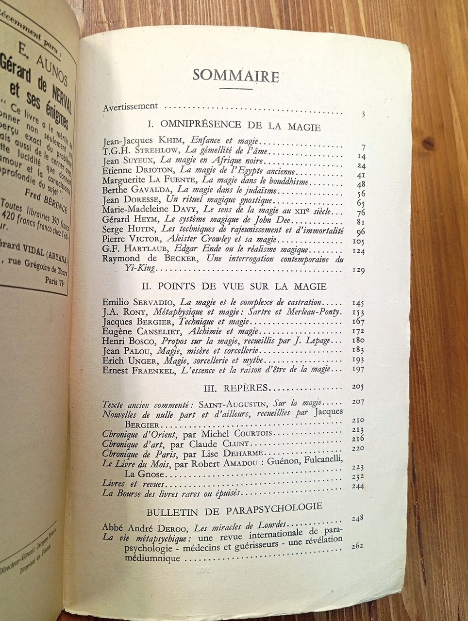 Brossura originale con copertina illustrata, 265 pagine. Sommario consultabile nelle nostre immagini. Lievi segni d'uso e del tempo, buona-ottima copia nel complesso -- "Fidèle à son propos, la tour Saint-Jacques aura atteint le but que nous nous sommes fixés en publiant ce nouveau cahier, si nous avons réussi à ouvrir, à entr'ouvrir au moins le dossier de la magie, comme naguère celui de l'astrologie et de la parapsychologie, si nous avons réussi à accroître l'information du lecteur est à l'acheminer vers une méditation devant l'objet mérite bien qu'on l'observe. La magie ne nous contraint elle pas,à sa manière qui est celle des énigmes, de reposer les problèmes fondamentaux de la nature du monde et de la nature de l'homme?"