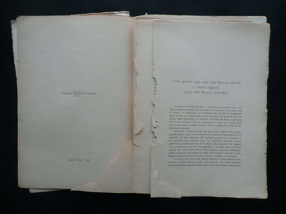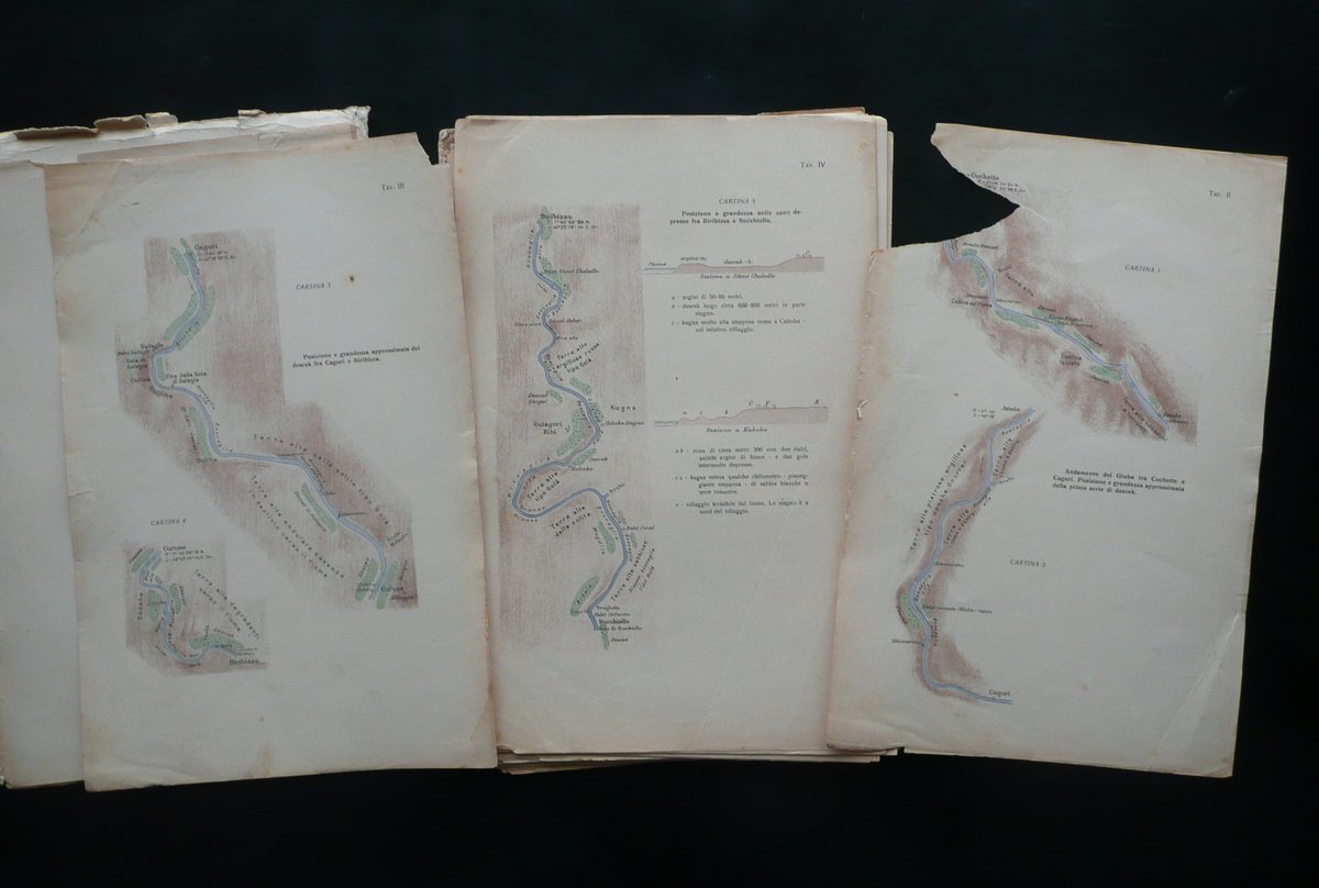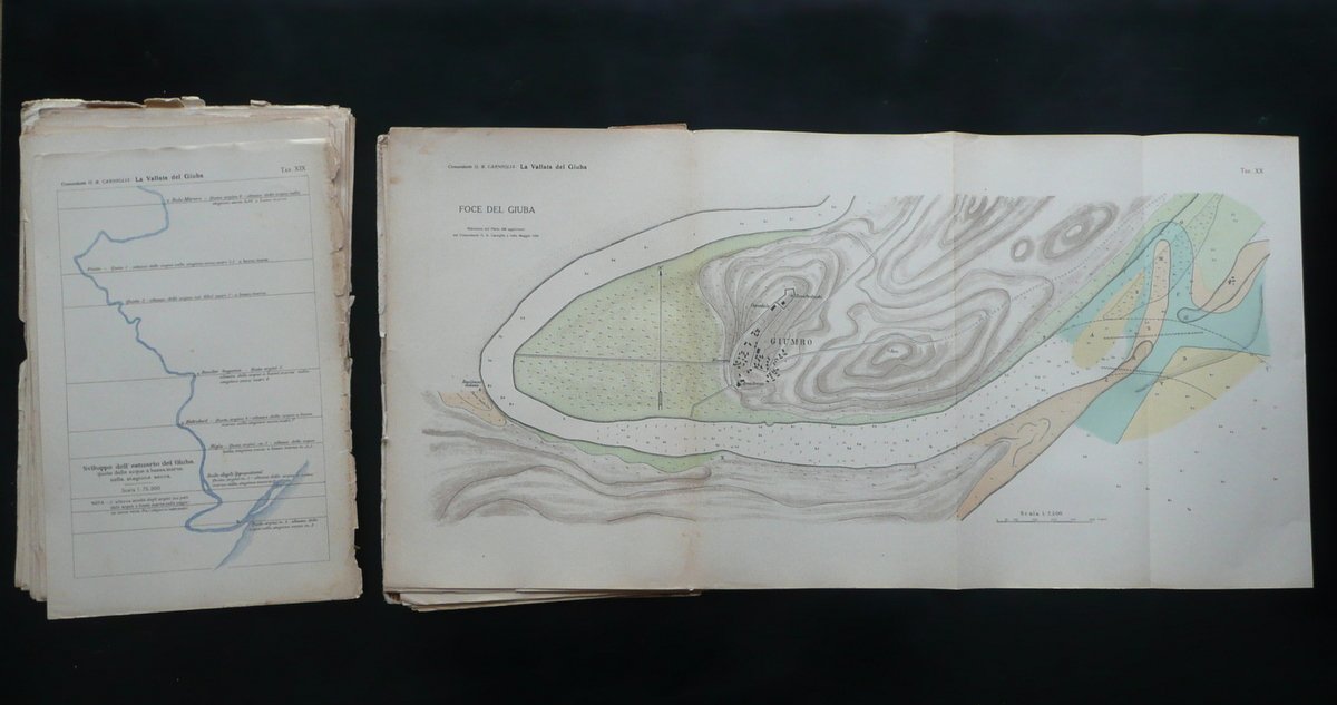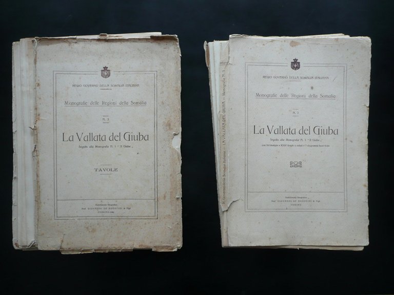 Regio Governo della Somalia Italiana, Monografie delle Regioni della Somalia N. 3 - La Vallata del Giuba Seguito alla Monografia N. 1 Il Giuba" **** La Vallata del Giuba Seguito alla Monografia N. 1 "Il Giuba" Tavole 2 volumi (opera completa); Stabilimento Geografico Prof. Giovanni de Agostini & Figli, Torino, s. d. (1927); cm 33x22, pp. 220 con 24 fototipie f. t. (volume monografico); XXXI (31) belle tavole a col., molte delle quali rip. pi√π volte (volume "tavole"); brossura ed. Condizioni di conservazione Volumi entrambi in discrete condizioni con tracce d'uso e alcune piccole leggere bruniture; dorsi di entrambi i volumi con vari strappi e mancanze, con conseguente distacco delle brossure e, nel caso del volume monografico, quasi totale sfascicolazione dell'esemplare in pi√π parti, unite solamente dalle cuciture (vedi foto); margini e angoli delle brossure e di qualche pagina con alcuni piccoli strappetti e mancanze. Volume monografico con cuciture allentate; pp. 193-220 staccate dal testo. Mancanza di una carta bianca (che corrisponde alle pp. 5-6) e della pagina recante l'indicazione "parte I" (che corrisponde alle pp. 7-8; vedi foto). Margini e angoli di qualche tavola con alcuni piccoli strappetti e pieghette; tavola II con una mancanza all'angolo sup. (vedi foto). Opera in due volumi: uno monografico con 24 fototipie fuori testo, l'altro con XXXI (31) tavole a colori, molte delle quali ripiegate pi√π volte (vedi foto). SETT92.L8495 N "