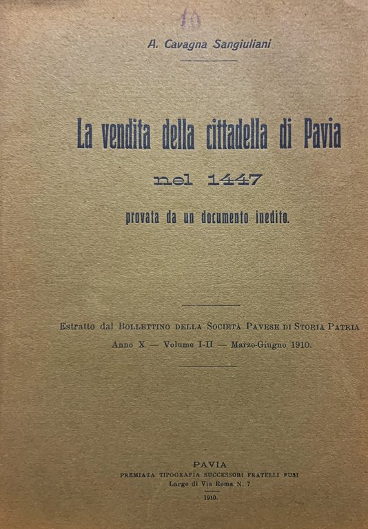 I ed.. Estratto dal Bollettino della Società Patria di Storia Pavese, Anno X - Volume I-II - Marzo-Giugno 1910. VIII/ 12/ brossura in cartoncino ruvido marrone con titoli in nero. Stato buono (copertina con bruniture - scucitura della rilegatura: il volume è completo - pagine brunite e con piccole fioriture).
