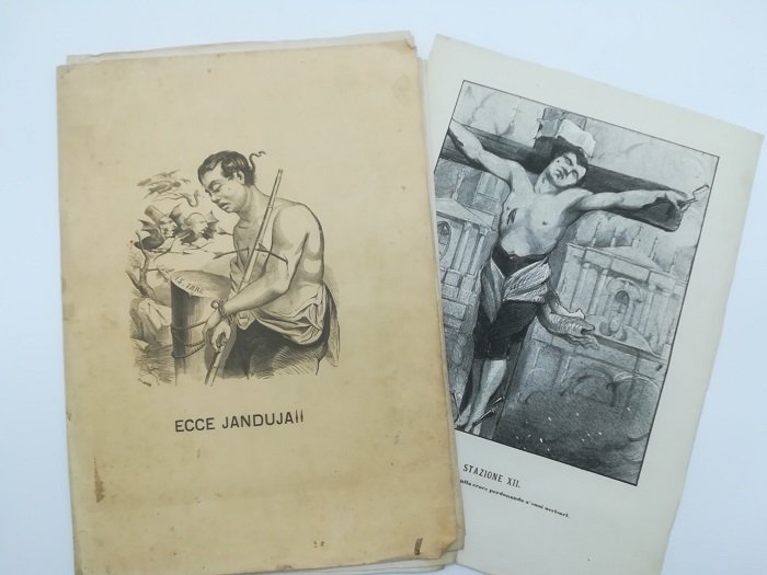 In 4 (cm 24,5 x 34), frontespizio inciso, seguono 14 tavole illustrate di gusto caricaturale in litografia, in fine una tavola doppia dal titolo "La Resurrezione" sottoscritta lit. Verdoni. Brossura editoriale illustrata con danni riparati. Nella scansione delle tappe della via crucis, non e' presente la stazione IX, ma la stazione XII e' ripetuta due volte, quindi l'esemplare e' completo di tutte le 14 stazioni. Esposizione amara dell'irriconoscenza dell'Italia verso i piemontesi, artefici del Risorgimento. Si tratta dell'opera piu' importante di Alessandro Allis (1836-1879), disegnatore che firmava con l'anagramma Silla e che divenne assai popolare collaborando giovanissimo a varie testate fra le quali Pasquino, Spirito Folletto, il Fischietto. L'opera, composta da 14 stazioni illustrate allegoriche rappresenta Gianduja che, al pari di Cristo, porta sulle spalle una croce di redenzione: quella per l'Italia unita. Nel 1864, il trasferimento della capitale da Torino a Firenze causo' a Torino un'agitazione popolare sedata violentemente nel sangue tra 21 e il 22 settembre. Piu' di duecento furono le vittime, oltre una cinquantina i morti ammazzati in piazza San Carlo. Venne quindi stampata quest'opera ma fu immediatamente sequestrata, non per vilipendio alla religione, ma perche' tra i vari artefici della Passione si potevano riconoscere personalita' politiche viventi da Minghetti a La Marmora, da Pepoli a Ricasoli.