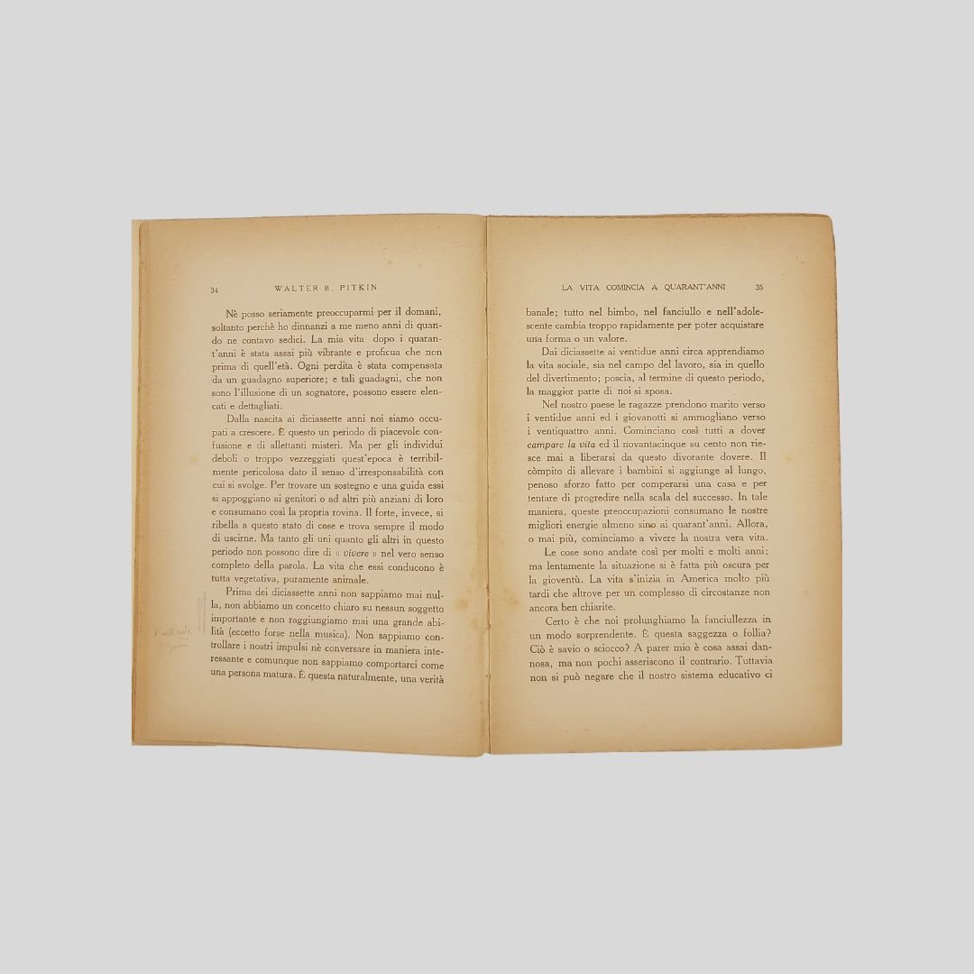 In-8° picc. (cm 21), pp. 218. Fioriture alle cop., dorso rinforzato, naturali segni del tempo. «Dopo la quarantina ogni giorno accresce la gioia di vivere e l’umanità conoscerà un domani migliore quando sarà costituita in prevalenza da persone di età media»