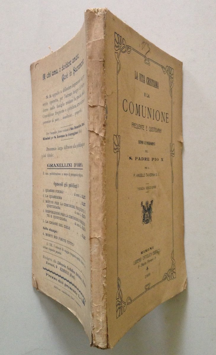 La vita cristiana e la comunione frequente e quotidiana secondo gli insegnamenti di S. Padre Pio X per P. Angelo Taverna Libreria Cattolica Editrice, Rimini 1909, cm. 17.5x12, pp. 80; terza ed.; br. ed. Condizioni di conservazione Esemplare in buono stato con leggere tracce d'uso e del tempo e con qualche brunitura; brossura editoriale con minime pieghette, mancanze e strappetti ai margini, agli angoli e al dorso. SETT132.L13270 MT