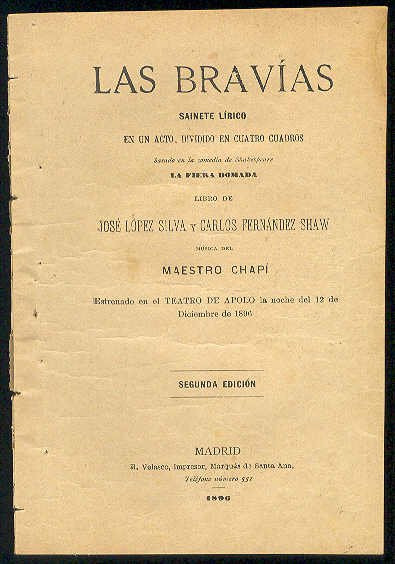 Las bravías. (Sainete lírico en un acto, dividido en cuatro cuadros. Estrenado en el Teatro de Apolo la noche del 12 de Diciembre de 1896) / Basado en la comedia de Shakespeare "La fiera domada") | Libri antichi e moderni | Lopez Silva, José Y Carlos Fernández Shaw