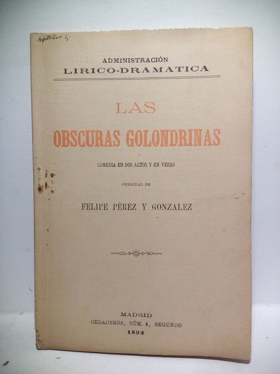 Las obscuras golondrinas. (Comedia en dos actos y en verso. Estrenada en el Teatro Lara el 17 de Marzo de 1892) | Libri antichi e moderni | Perez Gonzalez, Felipe