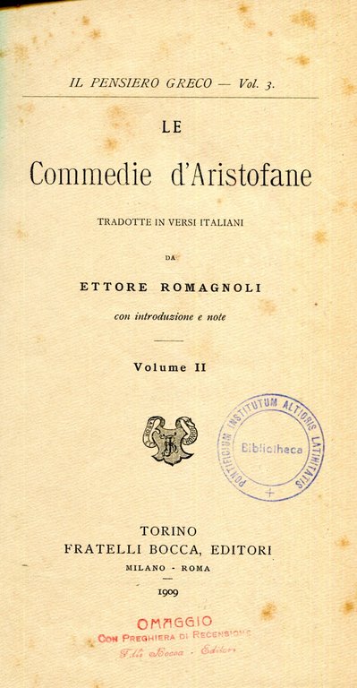 Le commedie di Aristofane tradotte in versi italiani da Ettore Romagnoli con introduzione e note. Volume 1 e 2 | Libri antichi e moderni | Atistofane, ,Atistofane