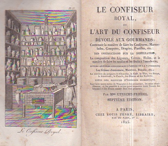 Le Confiseur Royal, ou l' art du confiseur devoilé aux gourmands; contenant la manière de faire les confitures, marmelades, compotes, dragées, pastilles, etc; des instructions sur la distillation, la composition des liqueurs, crèmes huiles et la manière de faire les ratafias et les fruits à l'eau de vie; divers articles concernant l'office et la pâtisserie; les crèmes d'entrements, macarons, biscuits, etc; la manière de préparer le chocolat, le café, le thé, les sirops, . Septième édition | Libri antichi e moderni | Utrecht Friedel (Louise Beate Augustine)