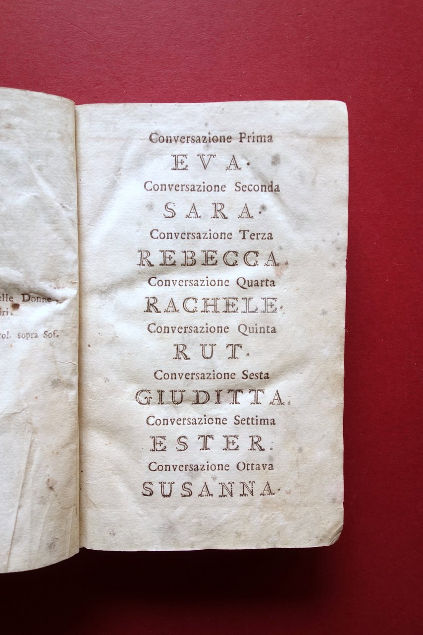Settecentina, Le Donne più Celebri della Santa Nazione Conversazioni storico - sacro - morali dell'abbate Eriprando Co. Giuliari edizione terza Per gli Eredi di Marco Moroni, Verona 1790; cm 17,5x11; pp. 382; legatura d'epoca in mezza pelle con titolo e piccoli fregi impressi in oro al dorso, piatti marmorizzati. Condizioni di conservazione Esemplare in discrete condizioni con tracce d'uso, coperta con alcune abrasioni e parziali mancanze al rivestimento marmorizzato, piatto ant. e alcune pagine con lievi tracce di vecchia umidità che non compromettono la lettura del testo (il piatto ant. è lievemente ondulato); leggere bruniture; pp. 381-382 con una piccola mancanza all'angolo inf. (vedi foto). Opera settecentesca di taglio religioso - moraleggiante (vedi foto indice delle conversazioni). In condizioni come da foto e da descrizione. SETT218.L20596 N