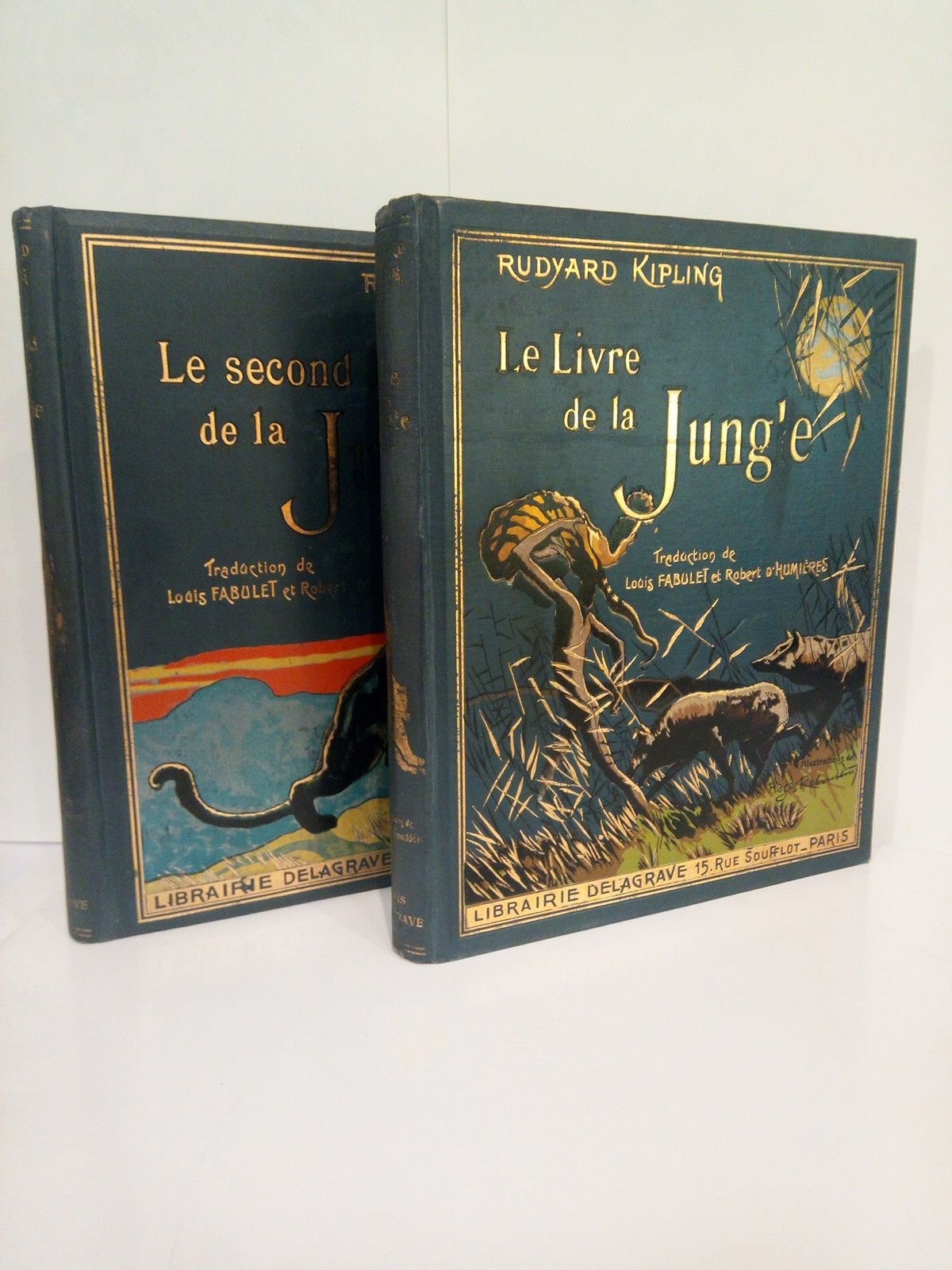 Douzième Ed.- Paris: Lib. Delagrave, 1932.- 2 vols. (176; 197 p.): Profusión de grabados en madera intercalados entre el texto y láminas fuera de texto, todos en negro; 4º mayor (28,2 x 23,5 cm); Texto en francés; Tela Ed. ilustrada con bellìsimas planchas en oro y colores.* Ambos lomos con perdida de la intensidad del oro. La cubierta anterior del tomo segundo tiene el dorado del título (Jungle) con pérdida de oro a partir de la J de Jungle. Por lo demás en excelente estado. CUENTOS, AVENTURAS, LEYENDAS, LITERATURA INFANTIL, CÓMICS, HUMORISMO.