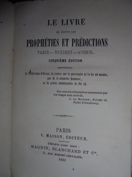 Le livre de toutes les prophéties et prédictions: passé, présent, avenir; suivi d' une lettre sur la proximité dela fin du monde/par M. le chanoine Remusat; et de la prière de Pie IX