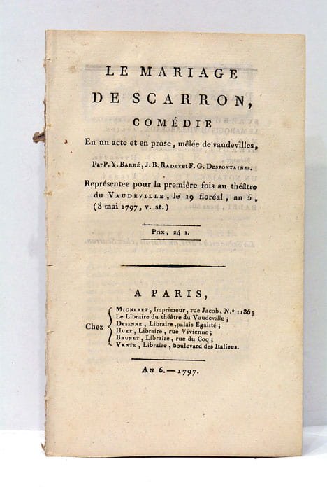 71 pages. (20,5x12,5 Cm). Dérelié. Cet ouvrage, co-écrit par P.Y. Barré, J.B. Radet et F.G. Desfontaines, s'inscrit dans le contexte post-révolutionnaire français, une période marquée par de profonds changements sociaux et politiques. Paru en 1797 à Paris, "Le mariage de Scarron" se présente comme une comédie en un acte, mêlant prose et vaudevilles, genre très prisé à l'époque pour son aspect divertissant tout en offrant une critique sociale sous-jacente. La pièce fut représentée au Théâtre du Vaudeville, lieu emblématique de la scène parisienne qui a contribué à populariser le genre du vaudeville. Rousseurs claires.
