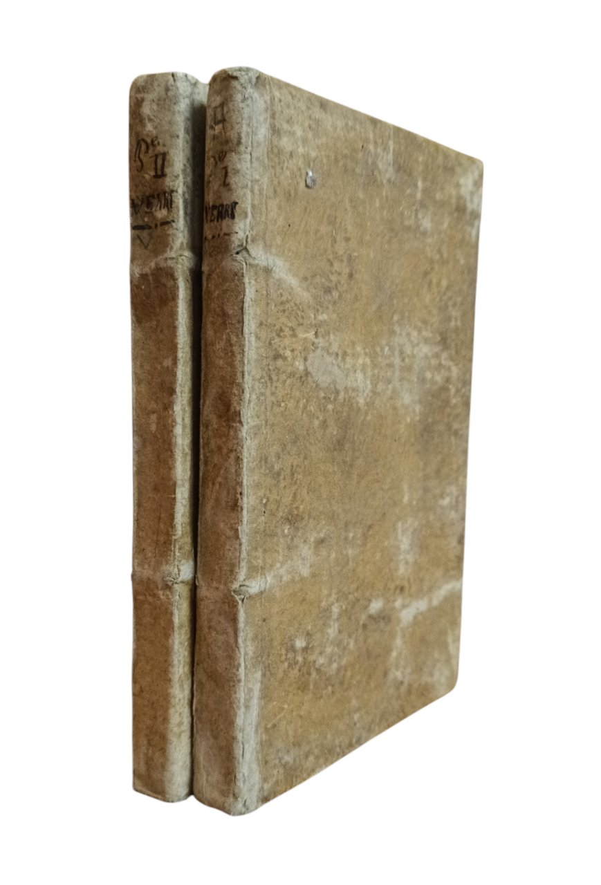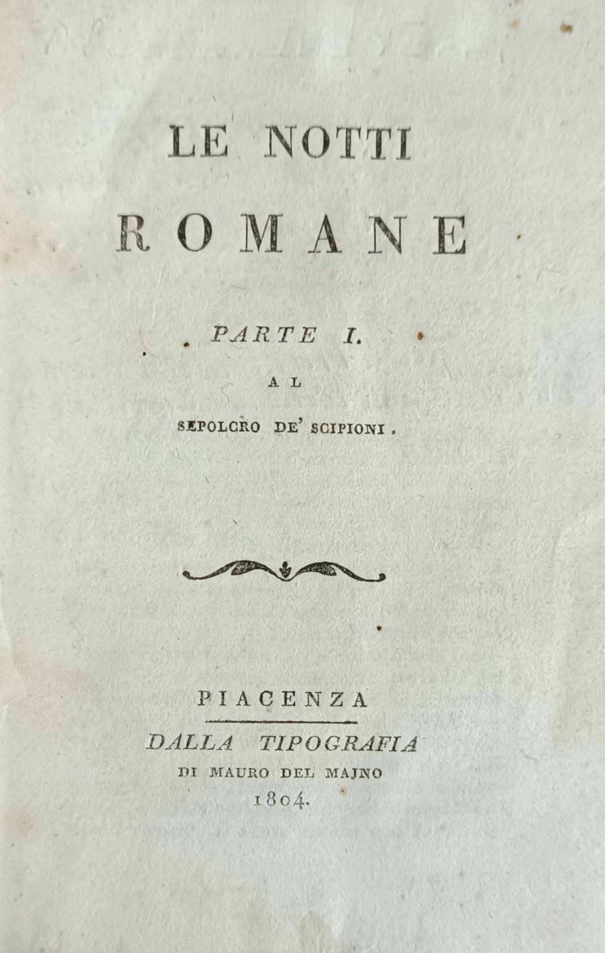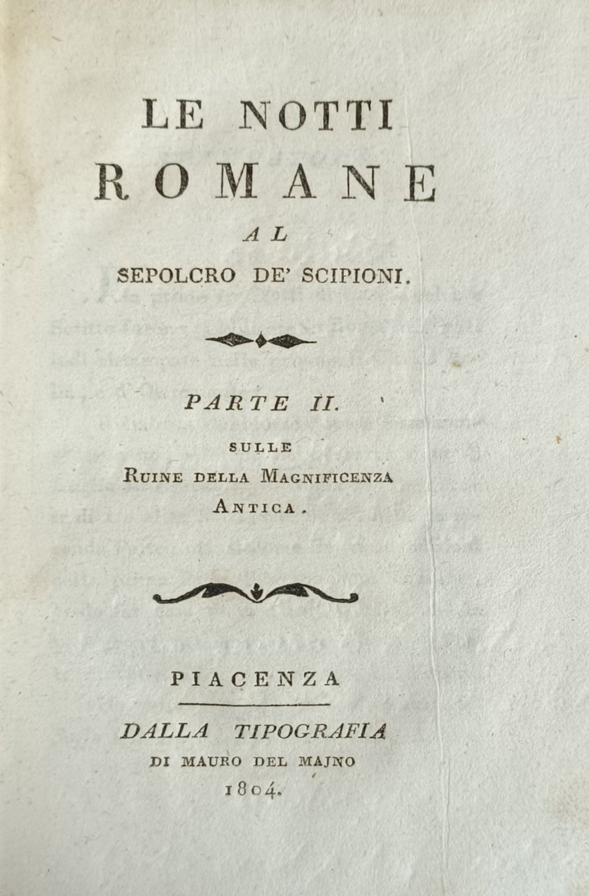 Alessandro Verri (1741 - 1816) scrisse la prima parte dell'opera nel 1782, pubblicando poi l'edizione definitiva del 1804.Lo scrittore trova ispirazione dalle iscrizioni sepolcrali collocate sulle tombe dell'antica famiglia patrizia romana degli Scipioni (ritrovamento avvenuto nel corso del 1780 a Roma nelle vicinanze della via Appia).Nella prima parte della storia immagina di incontrare gli spiriti degli antichi romani, guidati da Cicerone, e di parlare della grandezza e della decadenza delle civiltà, di istituzioni, di leggi e di religione. Nella seconda parte, invece, abbandonando il paesaggio notturno delle rovine sulla via Appia, lo scrittore immagina di accompagnare gli spettri verso una città nuova - quella denominata come “seconda Roma cristiana" - che trova il fulcro nella Basilica di San Pietro. in ottavo leg. cart. coeva, titolo manoscritto al dorso, tagli spruzzati 2 voll.: pp. 202, (2); pp. 198 Buono (Good) Buon es. legatura appena un po' vissuta, note manoscritte a matita all'antiporta di entrambi i voll..